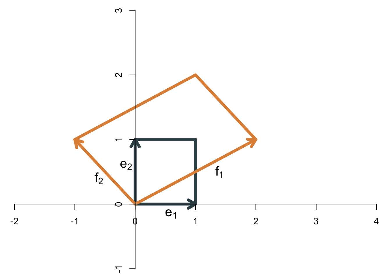 Als Beispiel betrachten wir die lineare Transformation \[ \mathbf{A}=\left[ \begin{array}{cc} 2 & -1\\ 1 & 1 \end{array} \right] \] Die folgende Abbildung zeigt, wie sich das Einheitsquadrat (das durch die beiden natürlichen Basisvektoren gebildet wird) vergrößert.