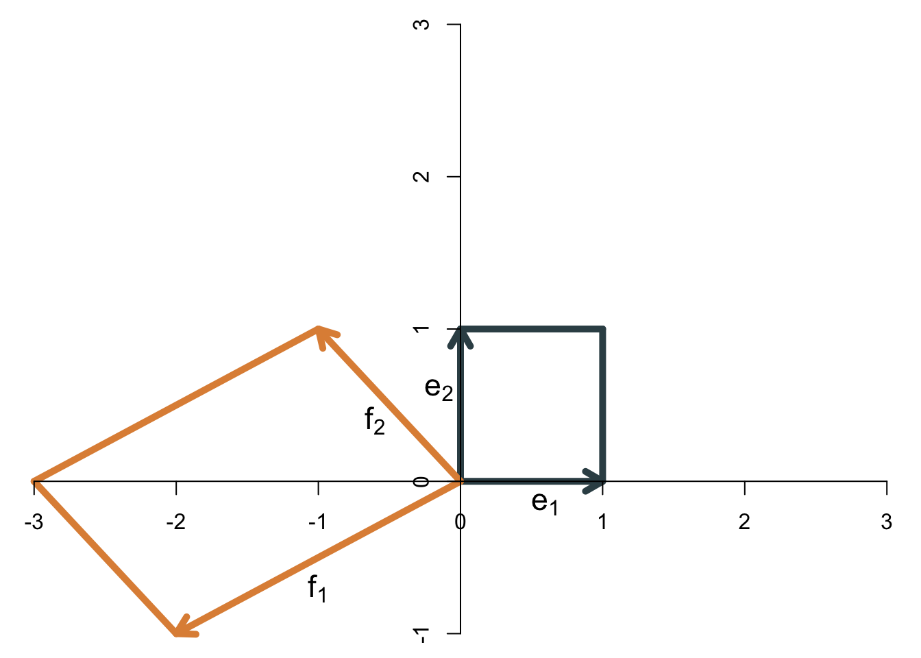 Die Fläche des Einheitsquadrats ist 1, die Fläche der Transformation (also des Parallelogramms) beträgt 3. Die Determinante der Matrix ist also \[ \det(\mathbf{A})=3. \] Ein Hinweis zur Notation: In der ökonometrischen Literatur wird die Determinante sehr häufig auch als \(|\mathbf{A}|\) geschrieben.