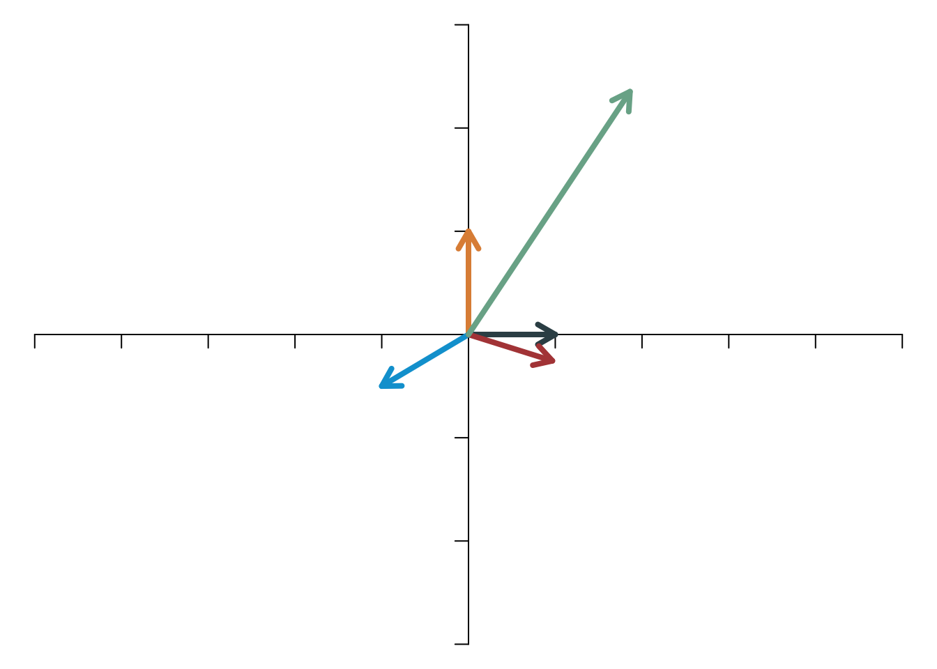 Man erkennt, dass drei Vektoren ihre Richtung verändern (nämlich die beiden Basisvektoren und der blaue Vektor, der nach unten links gezeigt hat). Die beiden anderen Vektoren (grün und rot) ändern ihre Richtung durch die Transformation nicht, nur ihre Norm ist anders als vor der Transformation. Der grüne Vektor wird durch die Transformation verkürzt, der rote verlängert.