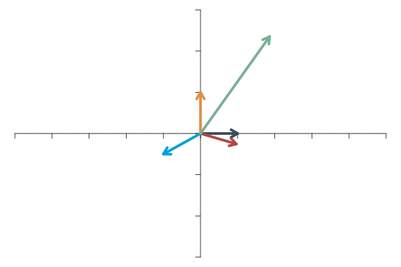 Die folgenden beiden Abbildungen zeigen das beispielhaft für die lineare Transformation, die durch die Matrix \[ \mathbf{A}=\left[ \begin{array}{cc} 4 & -3\\ -1 & 1 \end{array} \right] \] beschrieben wird. In der ersten Abbildung sieht man fünf Vektoren vor der Transformation, u.a. die beiden Basisvektoren.