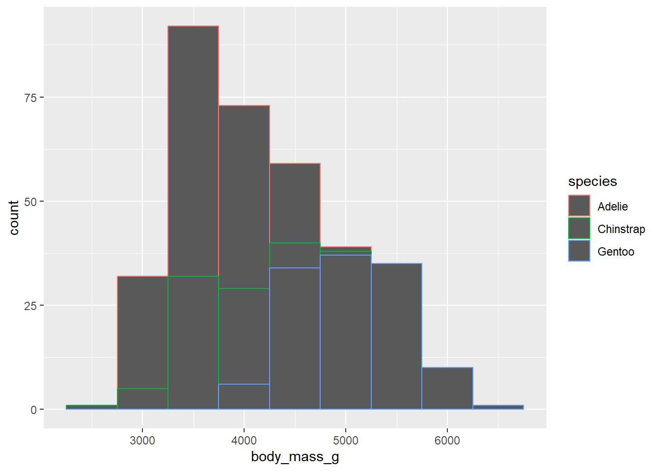 The histogram above shows the distribution of weights of all of the penguins. We can also show the species as different colours, by adding “species” to the aes() mappings.