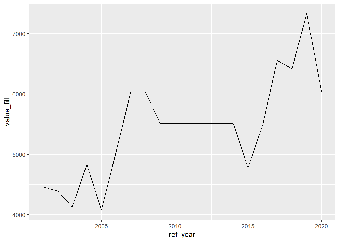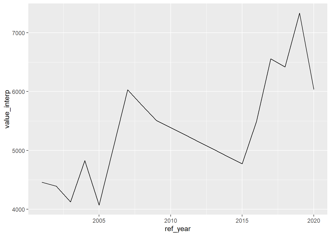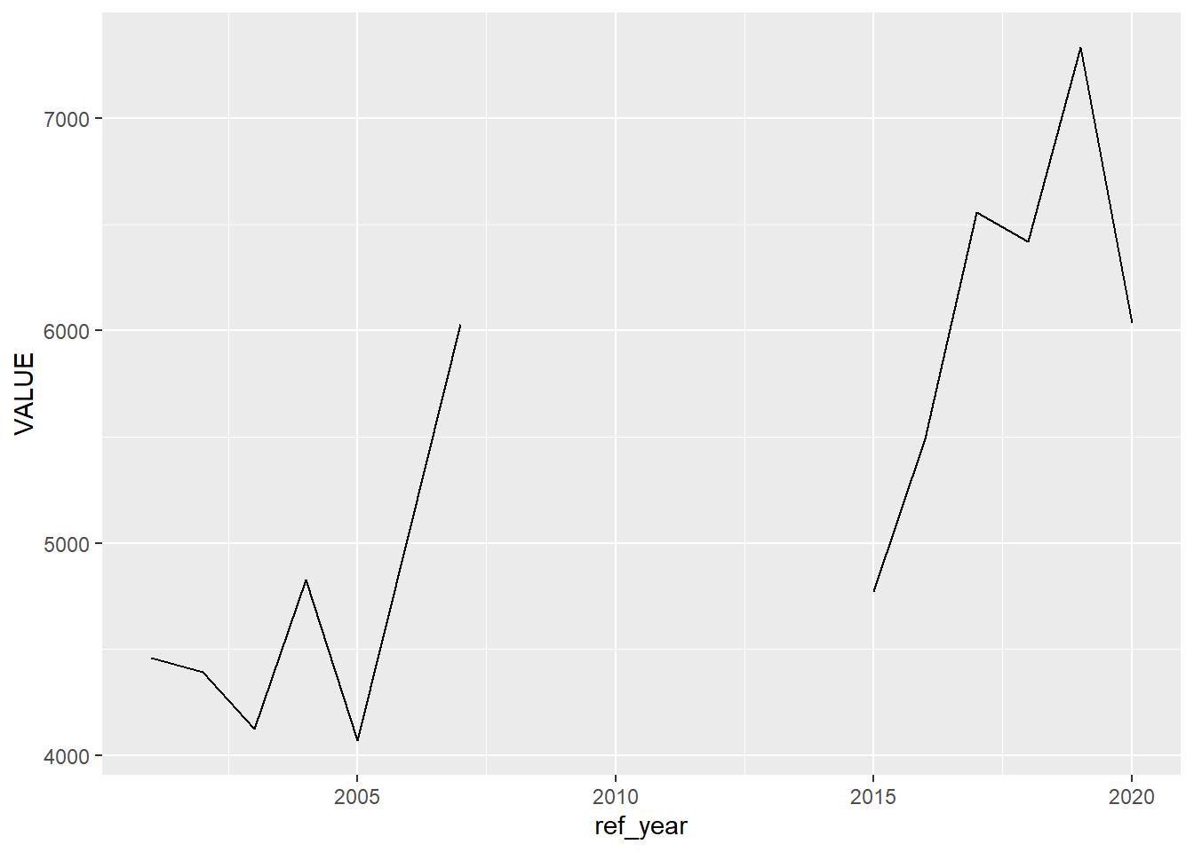 By mutating these various representations into a consistent YYYY-MM-DD format, we can now run calculations. In the example below, we calculate the average size of the Canadian labour force in a given year: