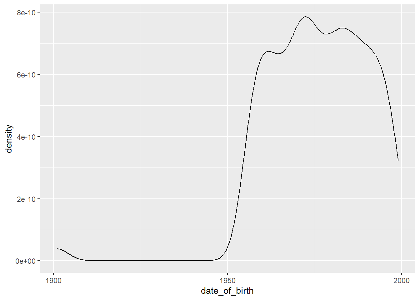 A plot can show us a wealth of information that cannot be expressed in the summary statistics. Let’s work through exploring the date of birth variable from the df_HR_main sheet.