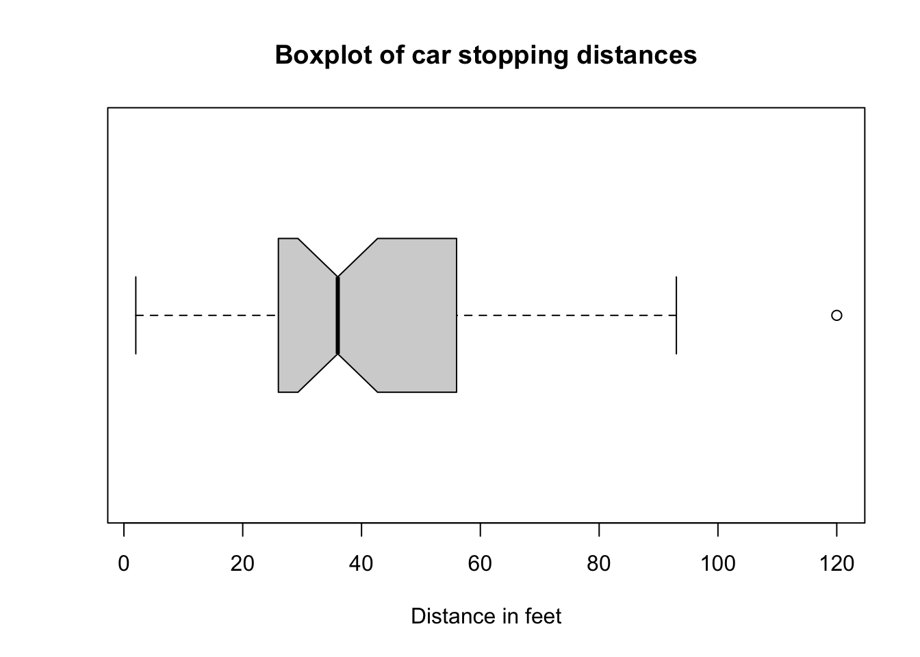 One simple method to check for outliers within numeric data is the use of boxplots, first popularised by John Tukey. These are best understood via a simple example for which we use the breaking distances from the built-in cars data set.