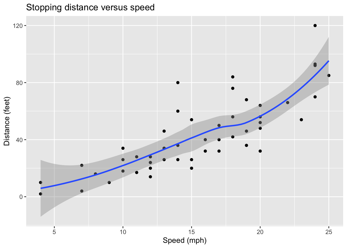x="Speed (mph)", y = "Distance (feet)")## `geom_smooth()` using formula = 'y ~ x'