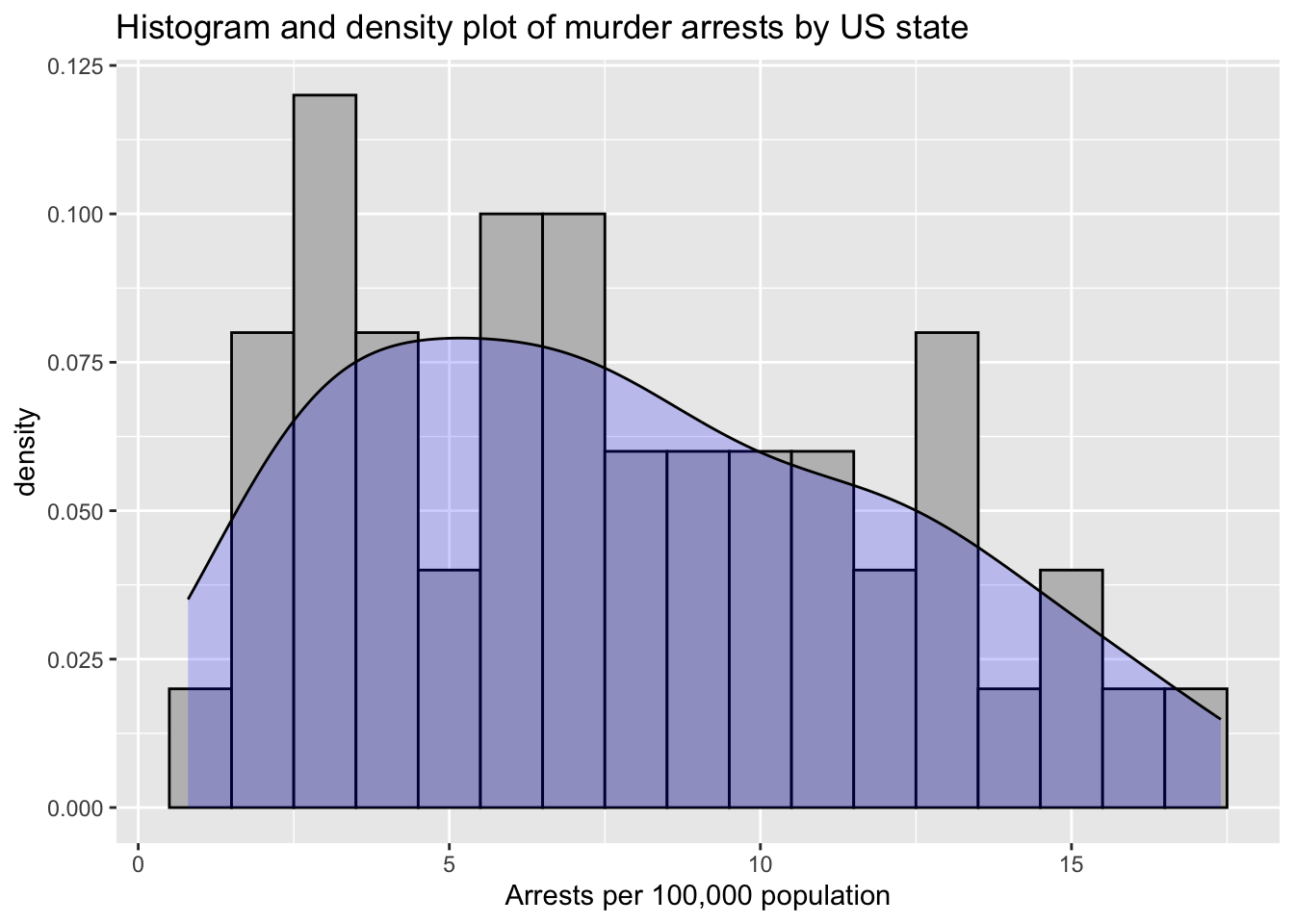 As a simple example, let’s say we want to visualise the distribution of the arrest rate for murder in the US using the built-in data set USArrests. As an alternative to the boxplot we can use a kernel density estimator. For a technical explanation see (Schucany 2004) and a rather nice visualisation from (Conlen 2020). I’ve chosen to superimpose this on a histogram which can be helpful when the sample is small so we can see the relationship between the actual observations and the smoothed kernel density. In order to make the y-axis meaningful it’s necessary to show the histogram as a probability rather than a count so that the density plot can be properly superimposed.