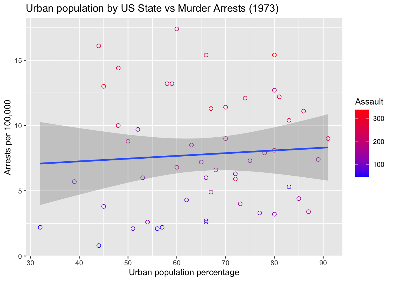 Another important part of EDA is to show how variables co-vary. Below is a plot also taken from the USArrests data set that shows the relationship between murder arrest rate and proportion of the population that is urbanised by state. Then the chart is enriched by also adding assault arrest rates (by colouring the points from blue (low) to red (high)). For some background on producing scatterplots, adding regression lines and then confidence intervals and smoothers see (Neitmann 2021).
