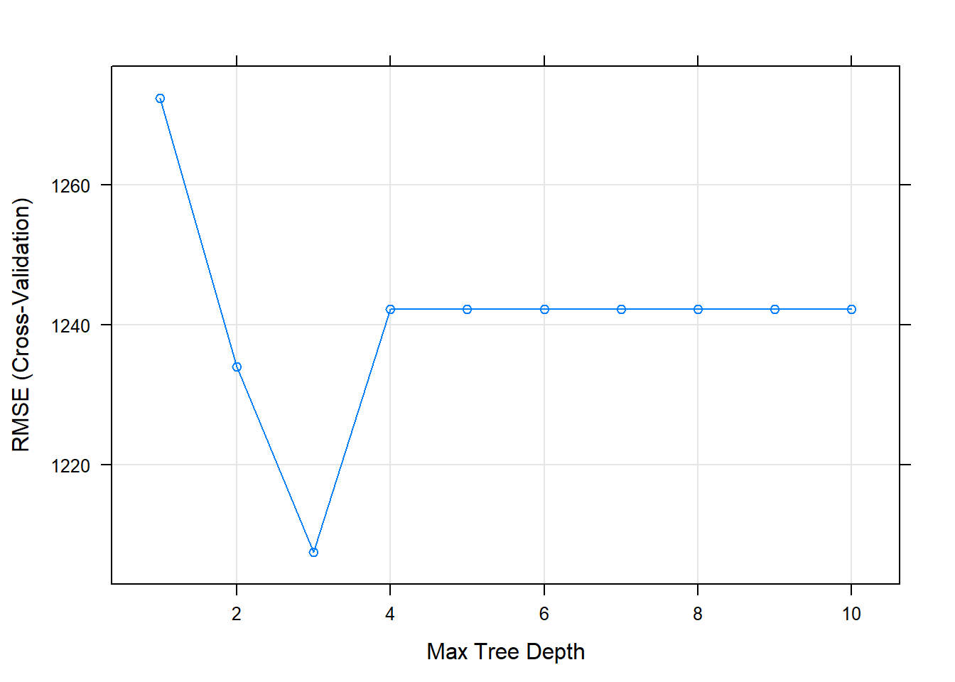 mutate(USDm2=price/surface_total)Si se fijan en https://topepo.github.io/caret/available-models.html van a ver que existen algunas implementaciones distintas de rpart. Usaremos la que pide usar el método ‘rpart2’ porque nos deja mejorar el parámetro maxdepth, que determina que tan “profundo” puede ser el árbol resultante. Como solo es una variable, usar expand.grid() no tiene mucho sentido, pero para acostumbrar a trabajar de una manera ordenada vamos a usarlo igual: