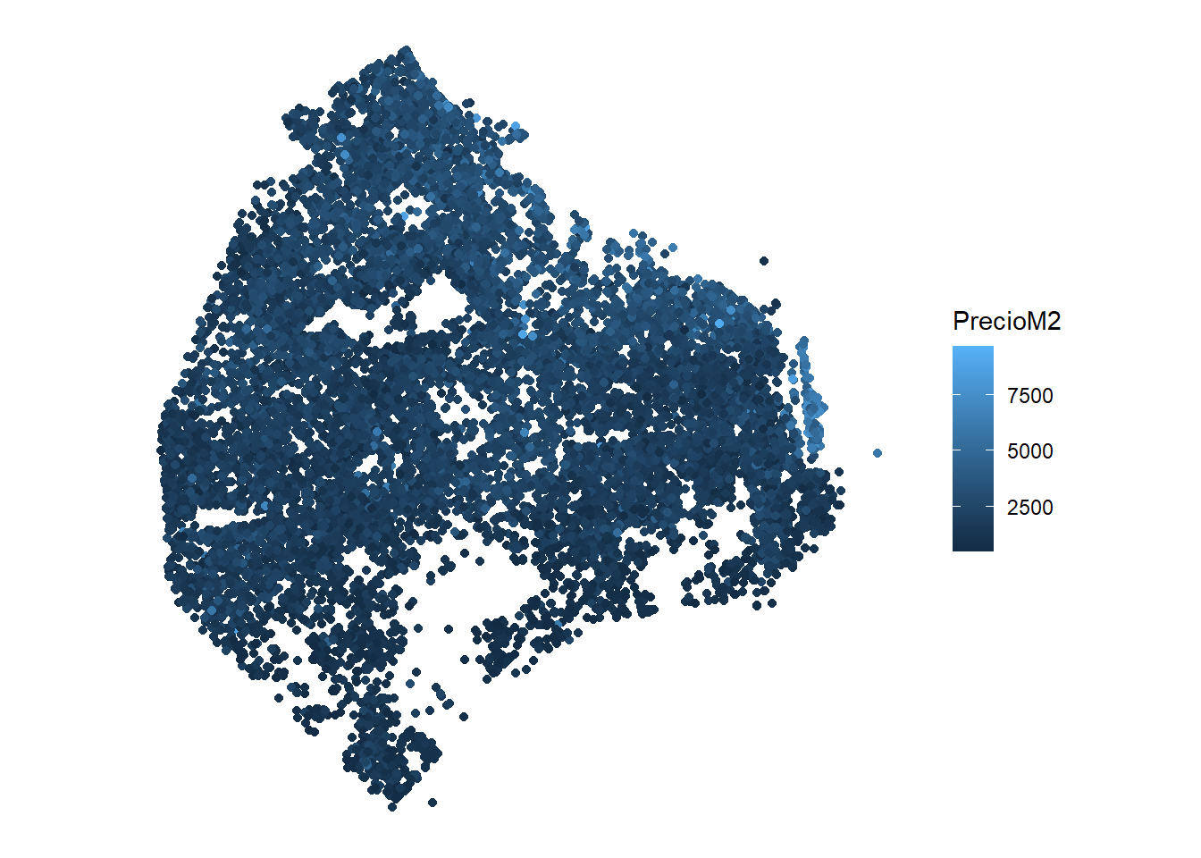 Mucho mejor. Sin embargo, si queremos mostrar el precio de las propiedades en el mapa según su valor debemos poner un contexto y también mejorar la escala. El Contexto serán los datos de polígonos que tenemos en el otro dataset, mientras que la escala intentaremos solucionarla usando la famosa paleta de viridis: