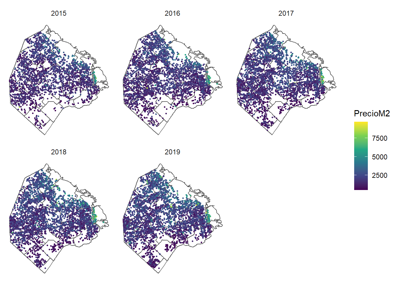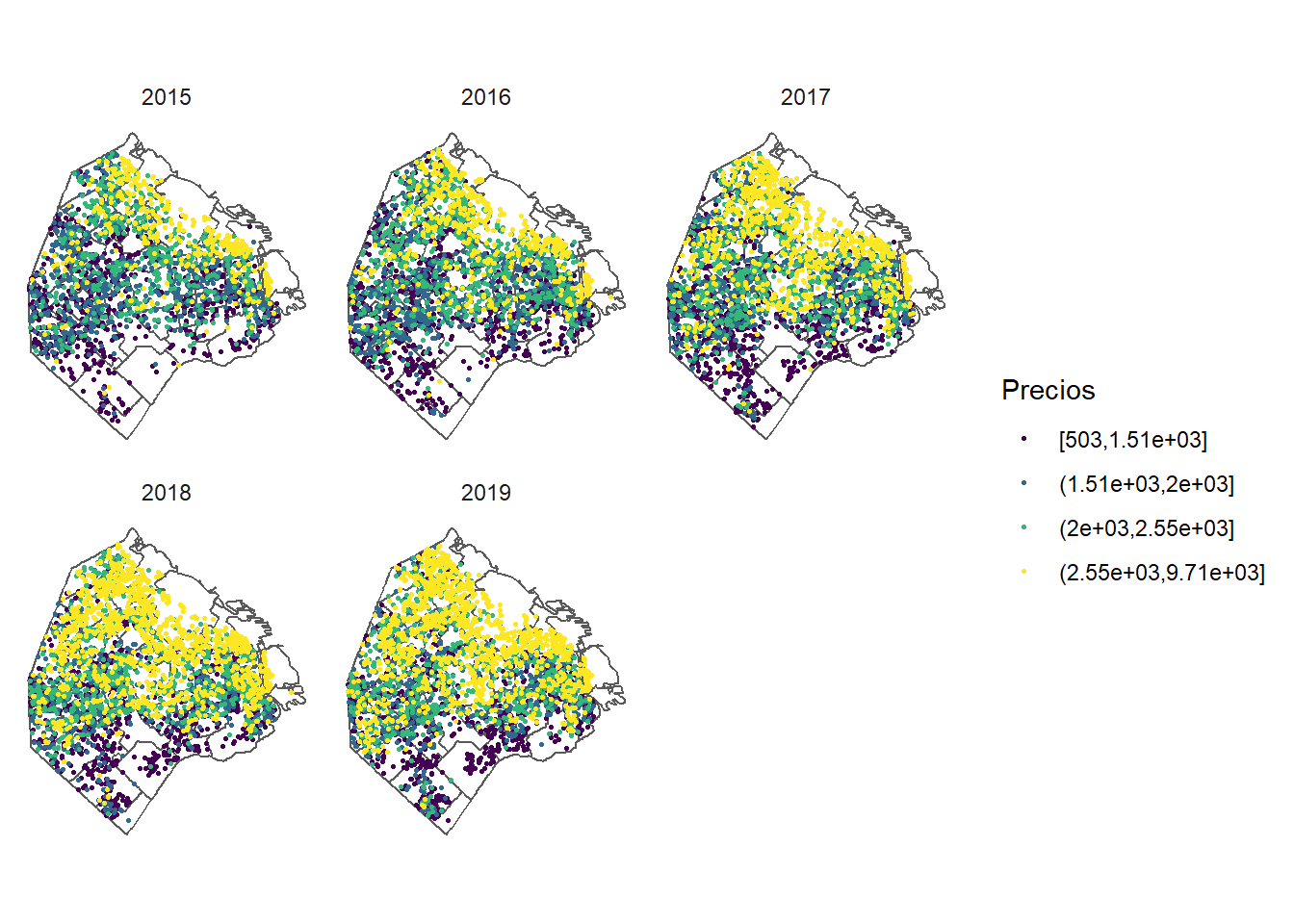 preciosCABABarrios <- st_transform(preciosCABABarrios,crs = proyeccionCenso2010)Una vez que ejecuten todo el código van a tener dos objetos nuevos: preciosCABA y preciosCABABarrios. El primero de ellos es una muestra estratificada por año y barrios (es decir que toma una muestra para cada uno de estos grupos) de los anuncios de ventas de inmuebles en la Ciudad de Buenos Aires, mientras que el segundo muestra la evolución por año del precio promedio en USD de los inmuebles ofertados.