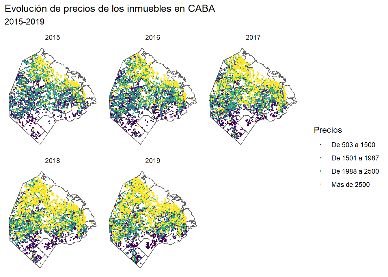 labs(fill="Precios",color="Precios",title="Evolución de precios de los inmuebles en CABA",subtitle='2015-2019')