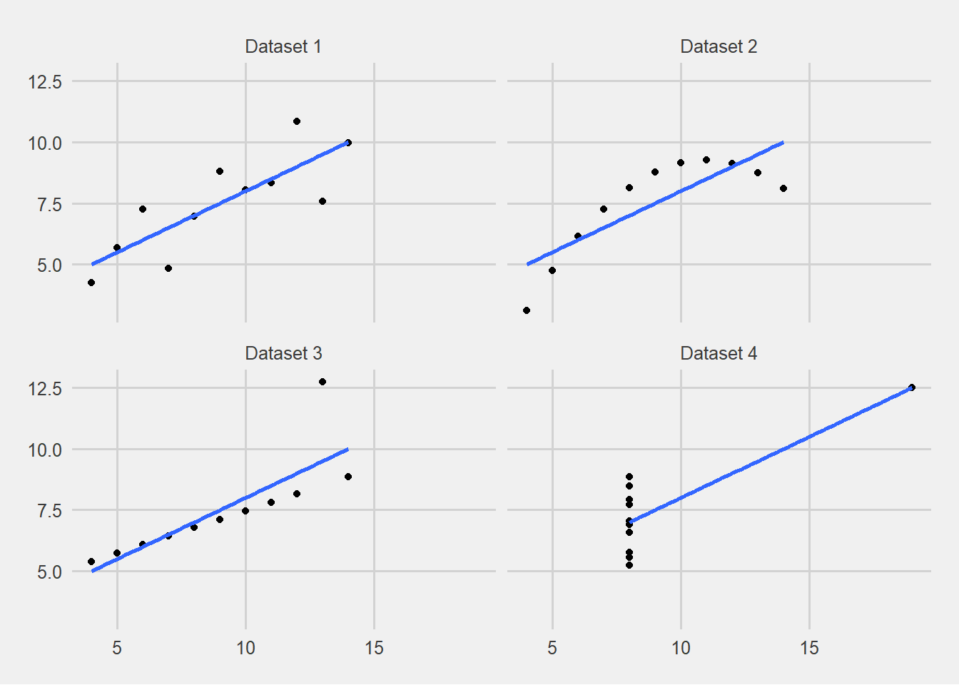 Este punto dista de ser uno moderno. En 1973 el estadístico Francis Anscombe aportó la siguiente evidencia sobre cómo muchas de las variables que solemos tomar como de resumen, o incluso de relación entre ellas, puede engañarnos si no visualizamos correctamente los datos: