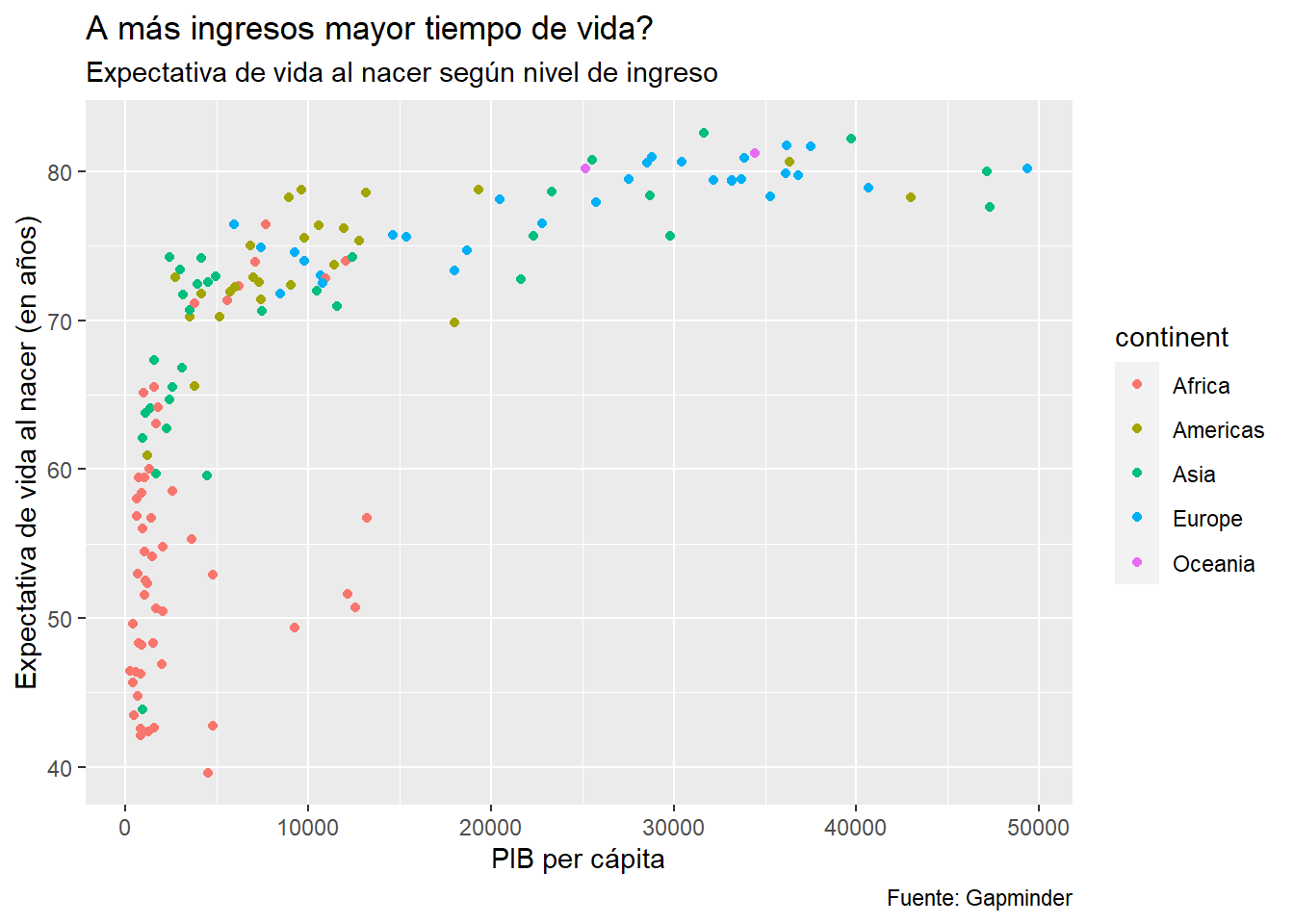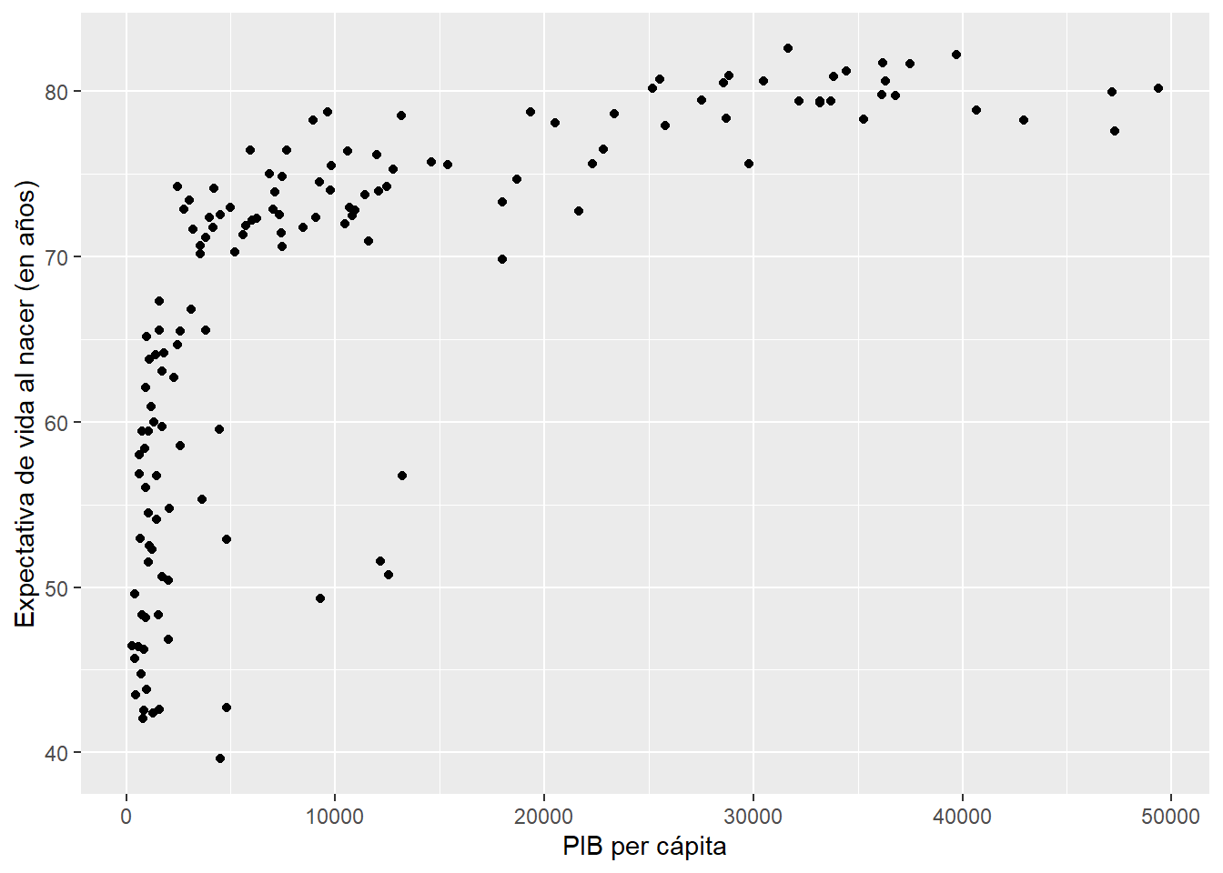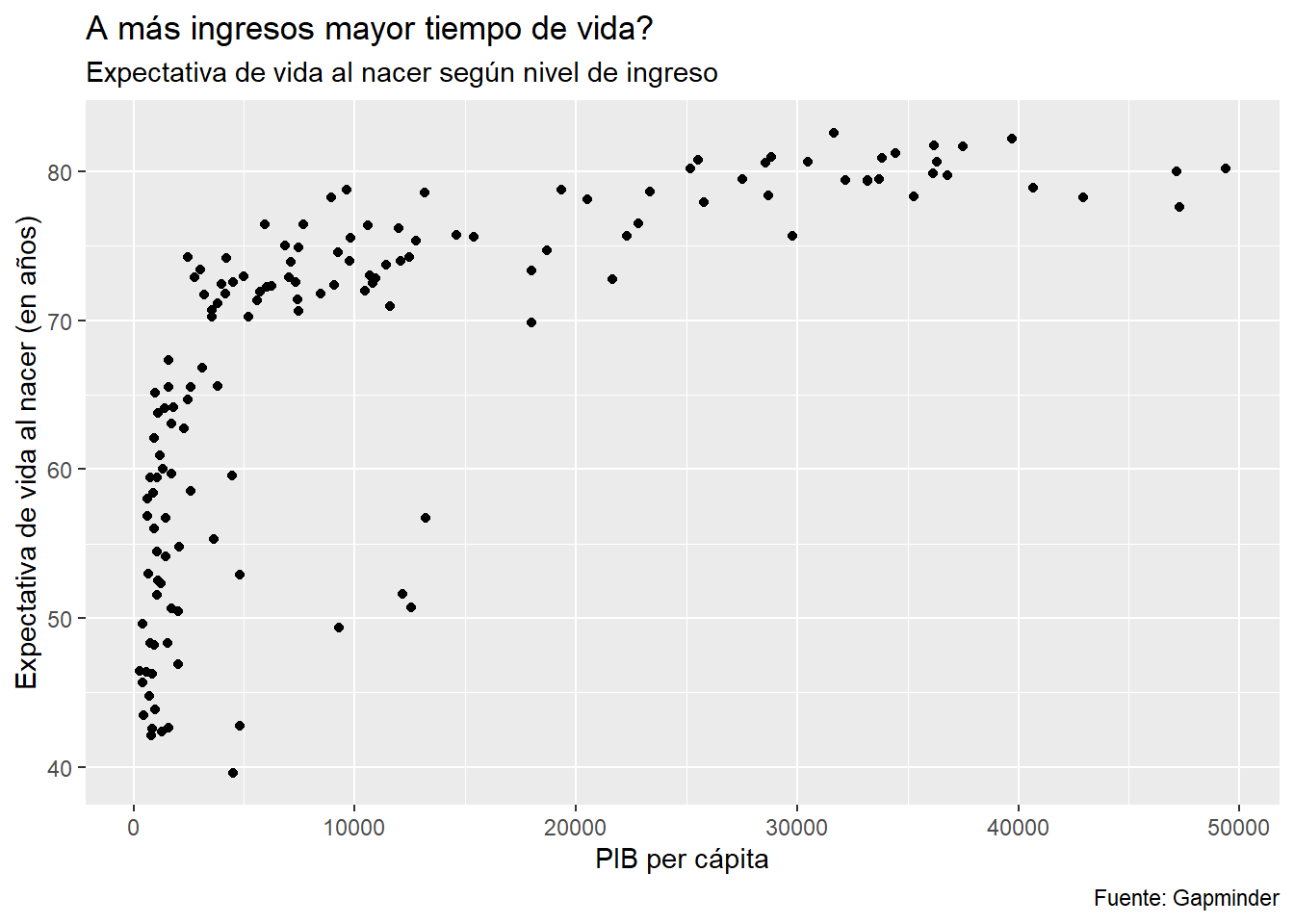 Nuestro gráfico scatter, que en ggplot se hace con geom_point(), muestra en el eje horizontal el PIB per cápita de los países y en el eje vertical la expectativa de vida al nacer. La grilla de fondo de color gris y los títulos de los ejes son defaults de ggplot, así como la - no tan recomendada - decisión de cortar al eje vertical en un valor levemente superior a 40 años.