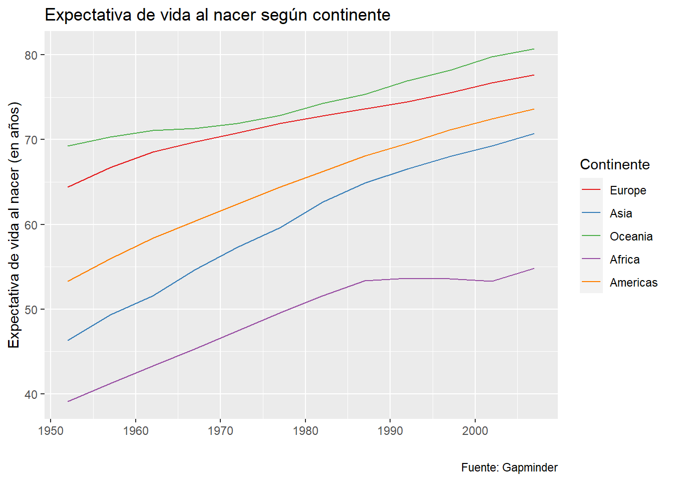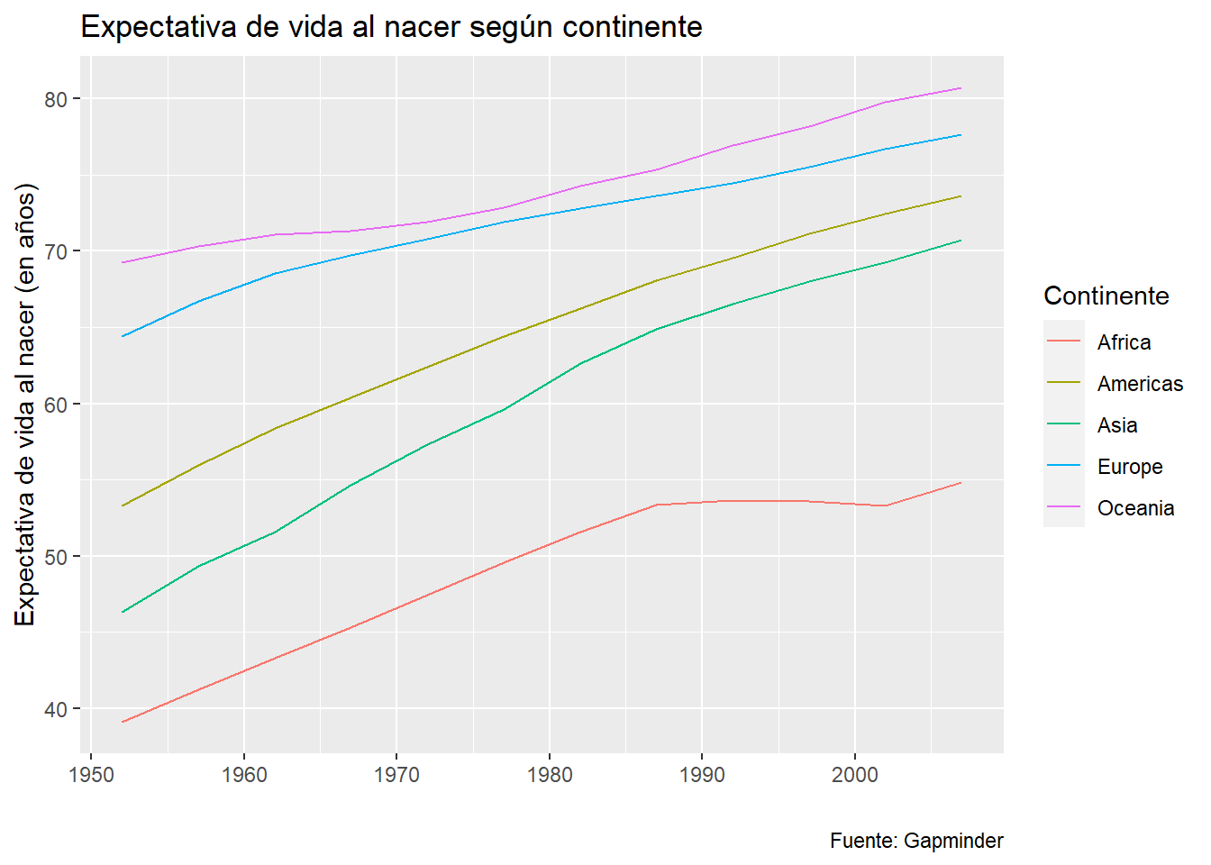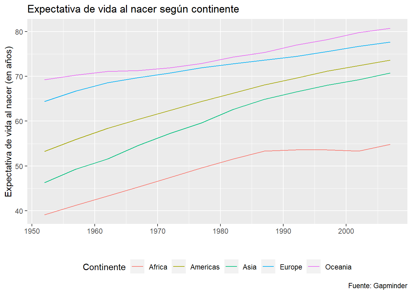 Digamos que queremos observar la evolución de la expectativa de vida al nacer promedio por continente. Usando las herramientas de tidyverse podemos generar este promedio de la siguiente manera: