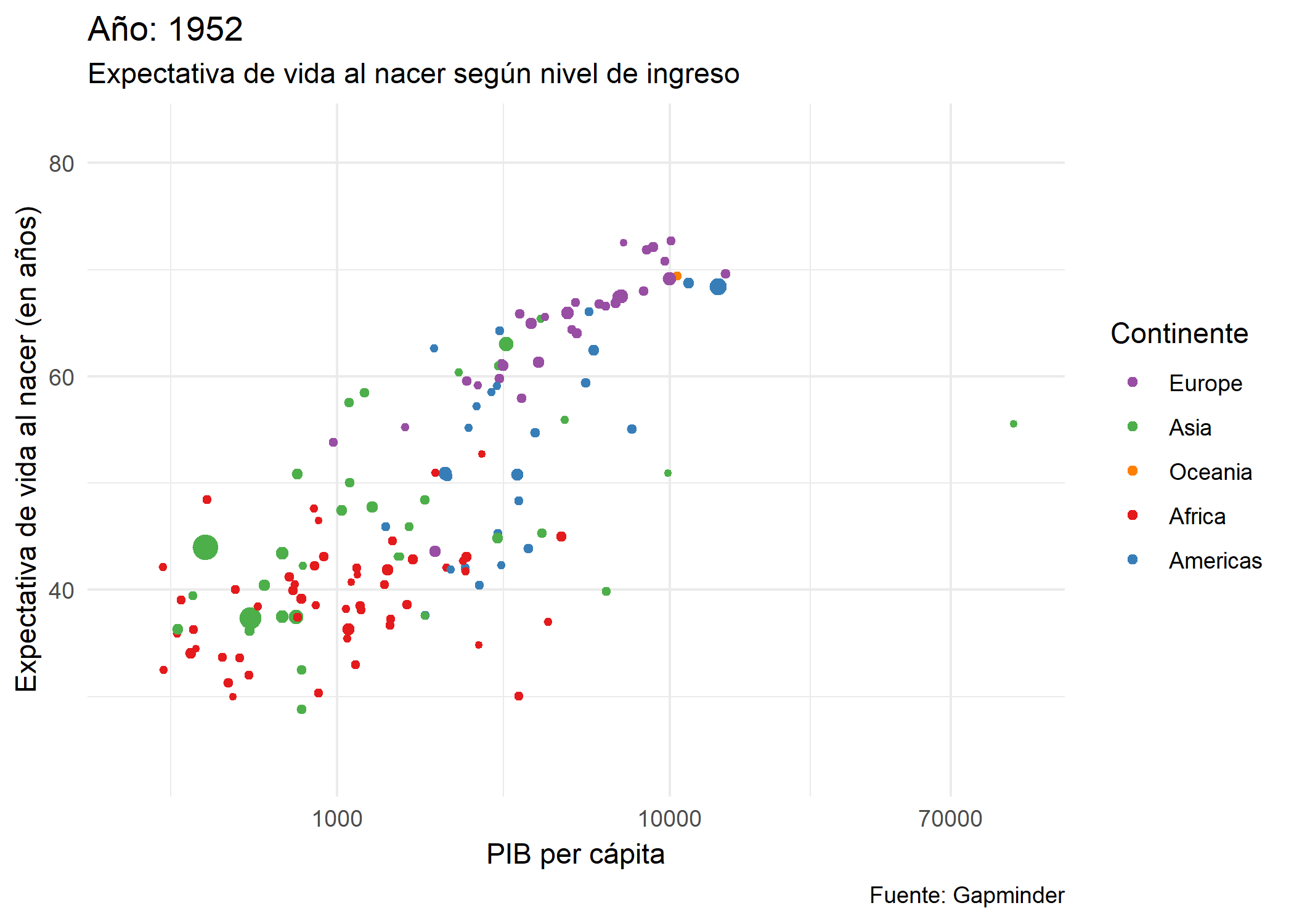El gráfico original de Hans Rosling muestra la evolución en el tiempo de las dos variables a lo largo del tiempo. Con el paquete gganimate solo debemos agregar dos líneas de código - y modificar levemente otras dos - para tener el gráfico que buscamos.