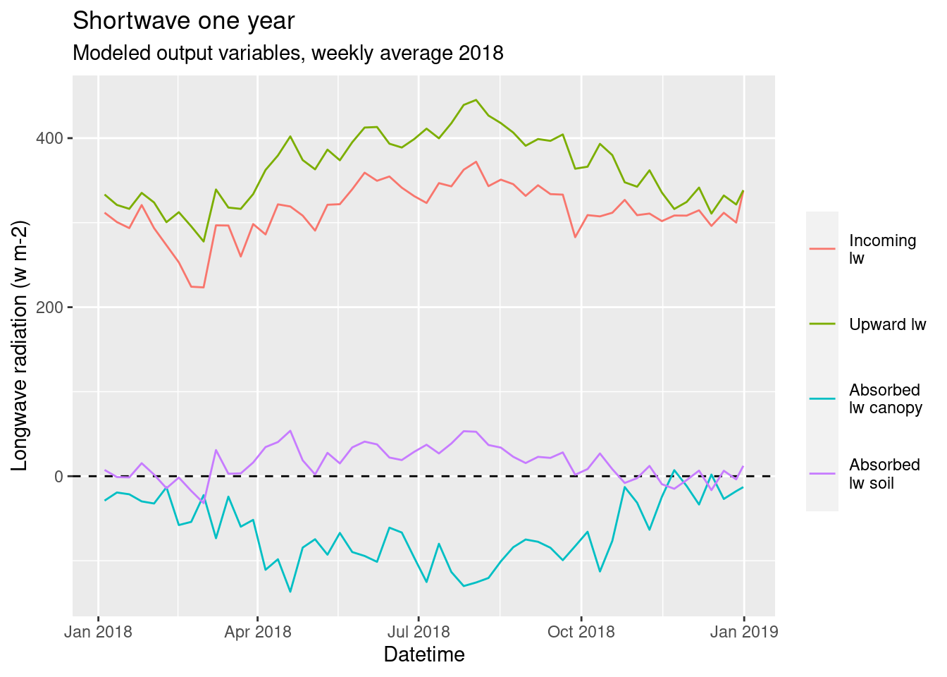 The radiation reflected by the canopy doesn’t have a big change over the year and overall canopy albedo remains for the all year between \(0.16\) and \(0.20\). Finally, the radiation absorbed the canopy follows, as expected, the pattern in the incoming radiation. During the spring its value are really similar to the shortwave absorbed by the soil, however this is only a coincidence.
