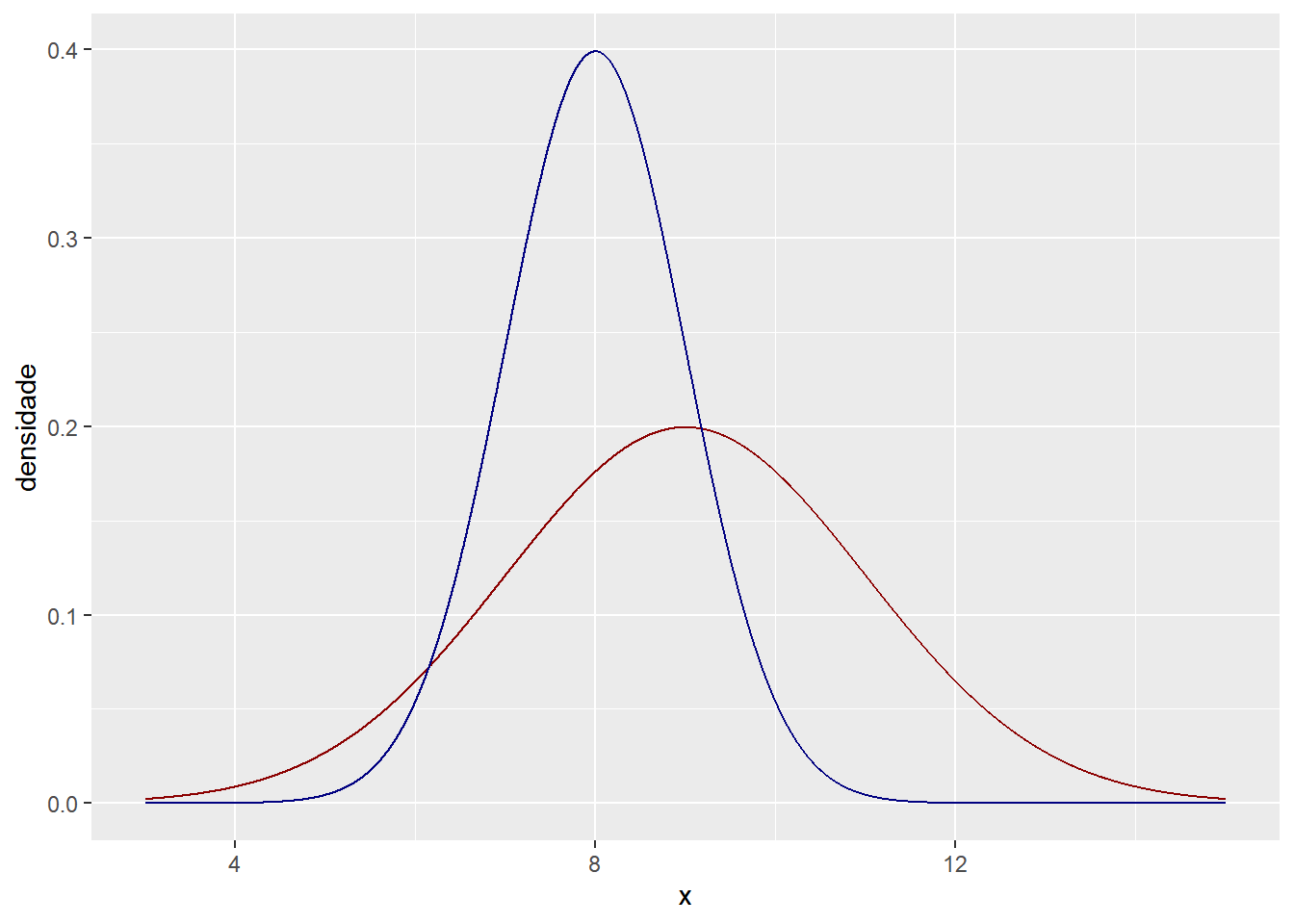 A curva normal é definida por dois parâmetros, a média \(\mu\) e o desvio padrão \(\sigma\) (ou a variância \(\sigma^2\)), que determinam onde a probabilidade está mais concentrada e o quão dispersa ela é, respectivamente. Veja as curvas normais com \(\mu\)=9 e \(\sigma\)=2 (em vermelho) e com \(\mu\)=8 e \(\sigma\)=1 (em azul). Vale lembrar que a curva não representa a probabilidade daquele ponto, mas sim a densidade de probabilidade.