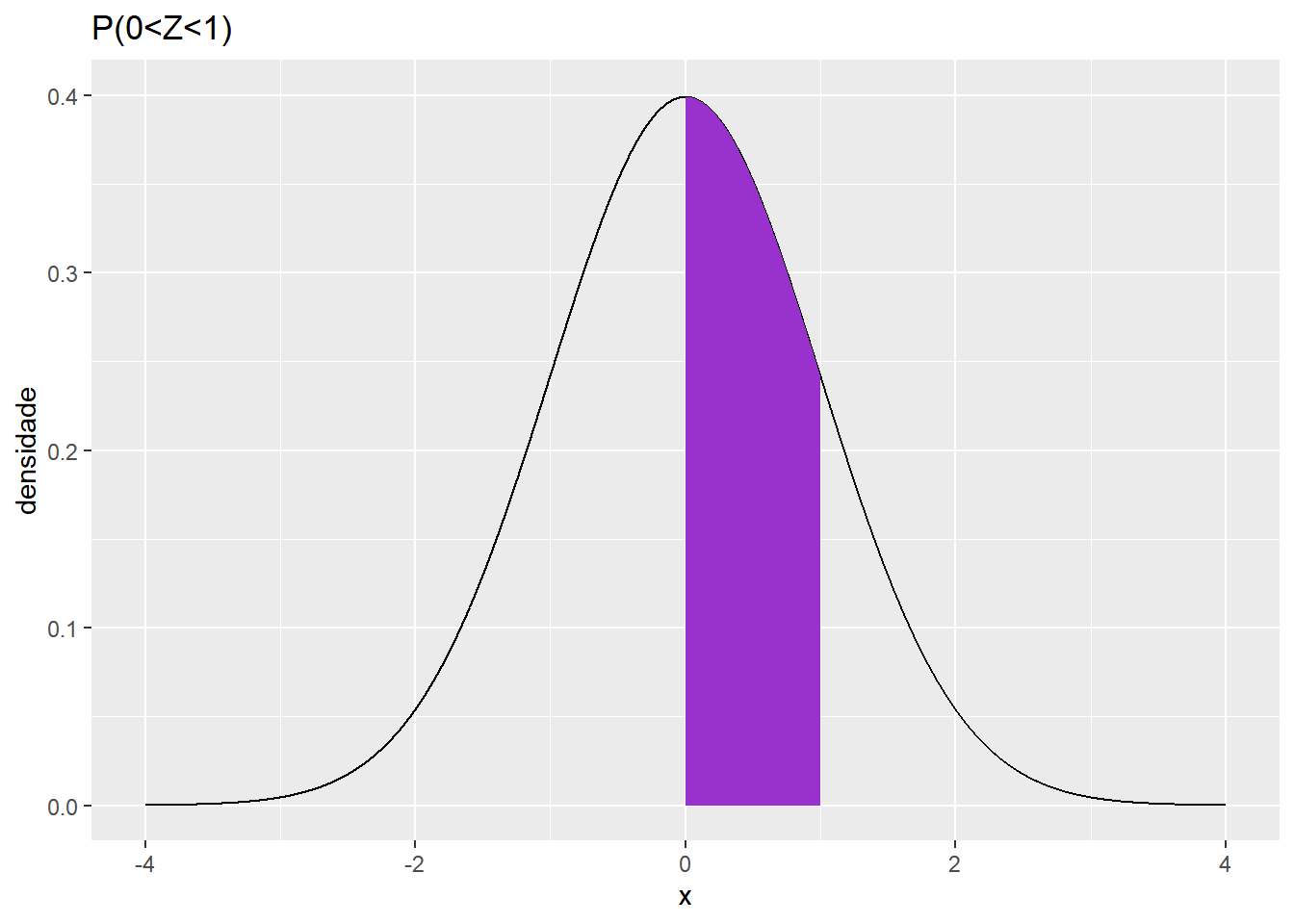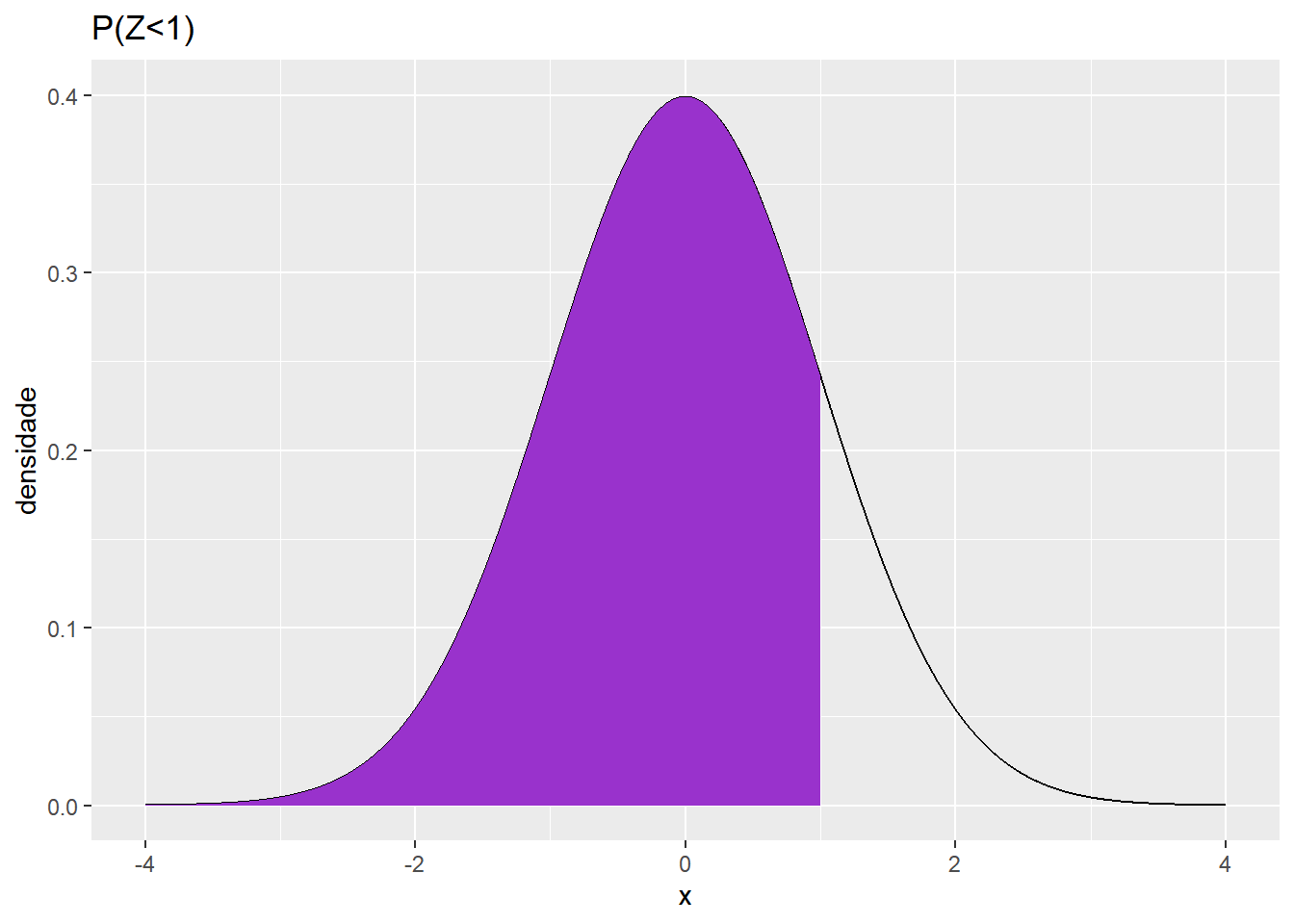 A probabilidade de uma variável aleatória que tem distribuição normal assumir um valor menor que ‘b’ pode ser calculada pela área abaixo da curva de densidade e à esquerda do valor b. Por exemplo, veja a probabilidade de uma variável Z (normal com média 0 e desvio padrão 1), assumir um valor menor que 1.