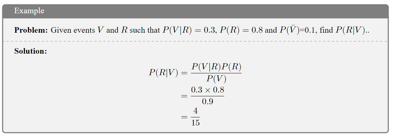 The reason for the shortness of this section is that any probability problem for which Bayes’ Theorem may be used can also be solved often more simply using a tree diagram and the rule for conditional probability. Nevertheless, you should be aware of the formula and it may be of use.