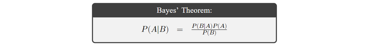 Bayes’ Theorem itself is easily derived by remembering that \(P(A\cap B)=P(B\cap A)\) and equating the multiplication rules for each, then rearranging to give: