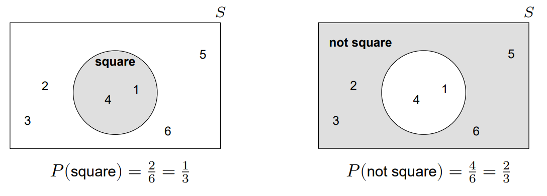 Venn diagrams can be a useful way of visualising a sample space. Below can be seen which equally-likely outcomes of the roll of a die are square numbers, and which are not.