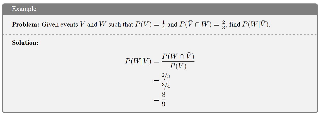 It should be noted that \(P(\bar{A}|B)=1-P(A|B)\), whilst in general \(P(A|\bar{B})\ne 1-P(A|B)\). Care should be taken to only make use of the valid complement to conditional probabilities.