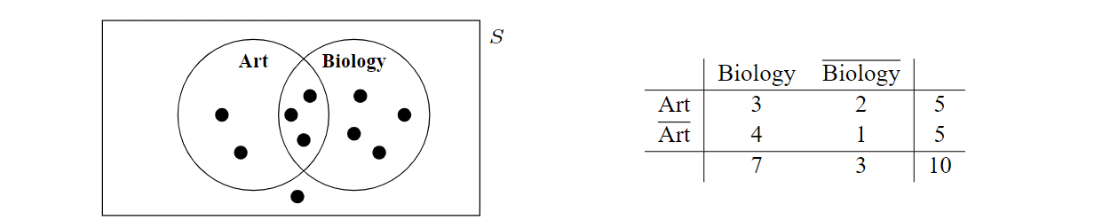 Suppose 17 pupils in a class are asked whether they love Art, and whether they love Biology, and the results are displayed in both a Venn diagram and a contingency table.