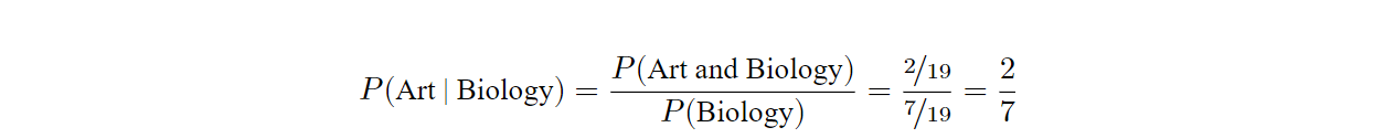 This is called a conditional probability and is notated as \(P(\text{Art | Biology})\) or \(P(\text{Art given Biology})\).