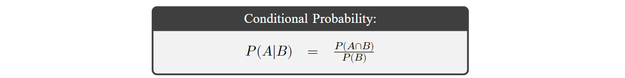 The rule for conditional probabilities below is one of the most significant in the context of much of the statistical analysis to come in this course, and it should be carefully learned. Not that, in general, \(\mathbf{P(A|B)\ne P(B|A)}\) and care should be taken not to mix these up.