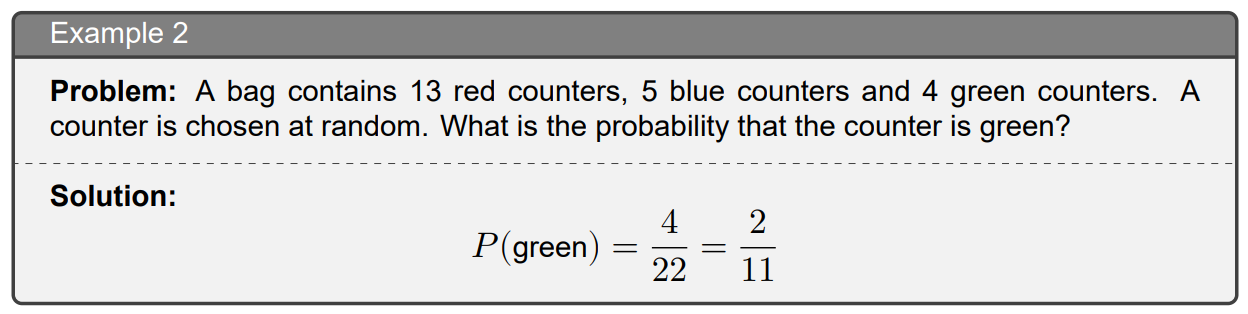Equally likely outcomes: \(\{\text{HH},\text{HT},\text{TH},\text{TT}\}\)