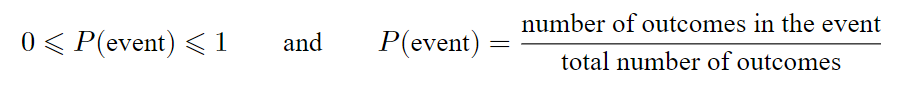 An event is typically a set of outcomes. Assuming the outcomes are equally likely, the probability of an event occurring can be calculated. Note that for any event: