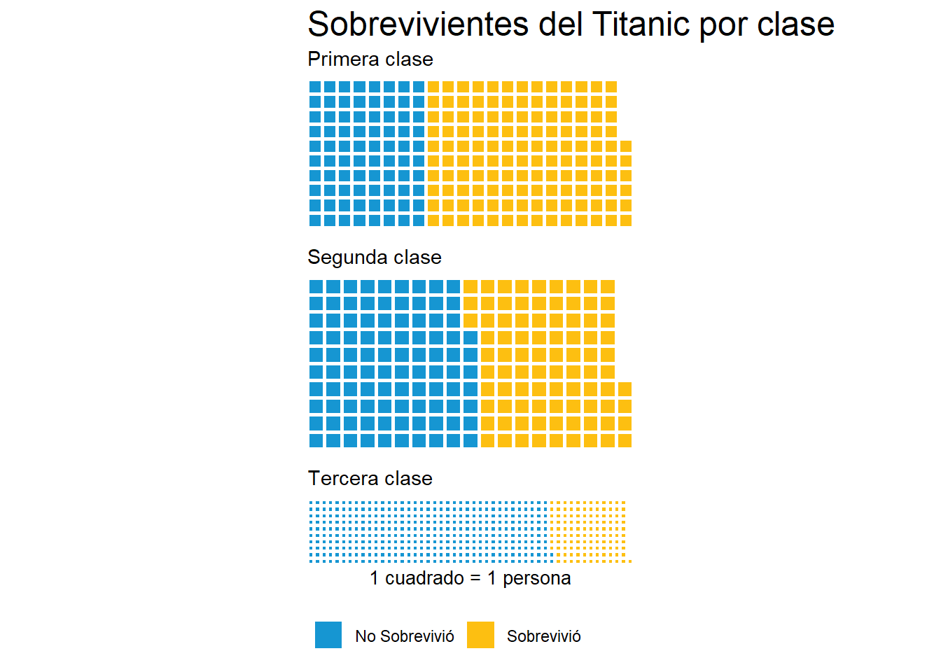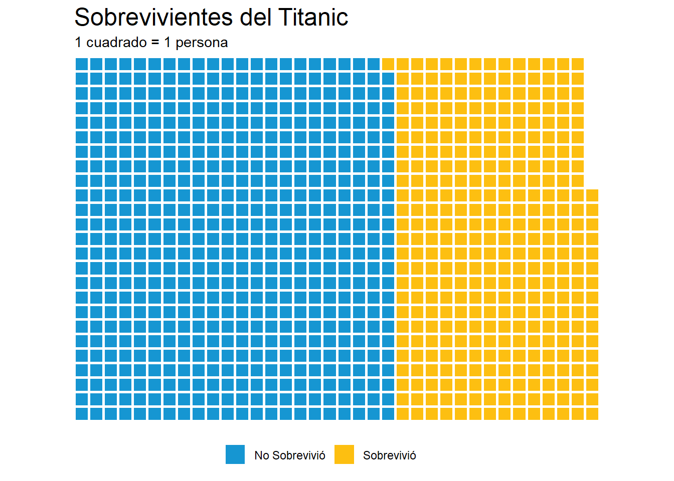 En un capítulo anterior realizamos análisis exploratorios. Como nuestro objetivo era entender los datos de manera rápida (ver Sección 4.3), dichos análisis no se focalizaron en comunicar visualmente hacia un externo o consumidor. Retomemos el dataset del Titanic y hagamos un gráfico tipo waffle (también conocidos como gráficos tipo tile o azulejo).