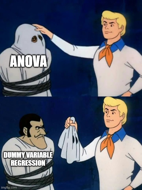 …But I guess if we are talking about how two different looking things are in fact the same thing, we should talk about ANOVA and Regression with dummy variables. We can use regression to obtain the exact same results as we did with the ANOVA above: