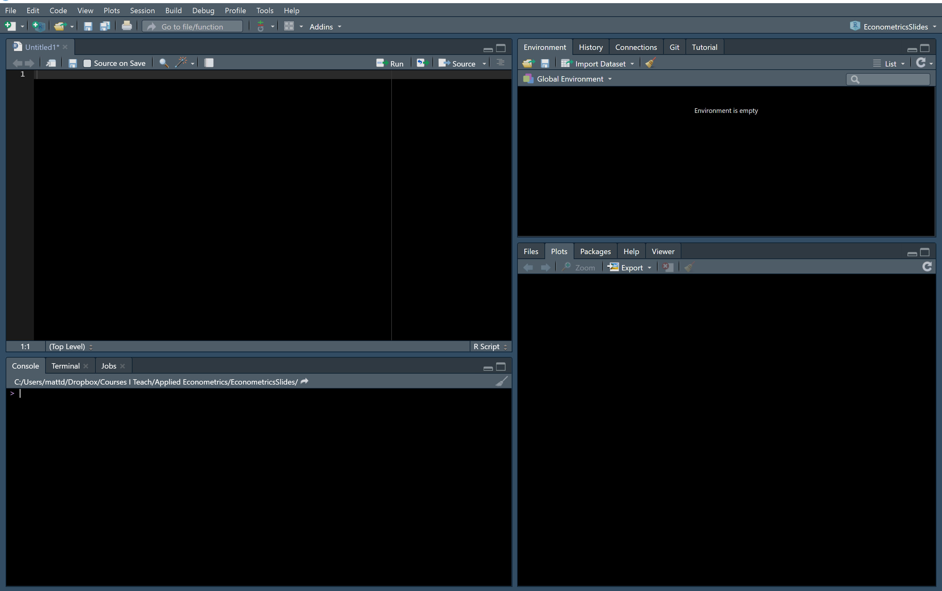 Note that this looks a little different from what RStudio looks like “out of the box” but the differences are small.