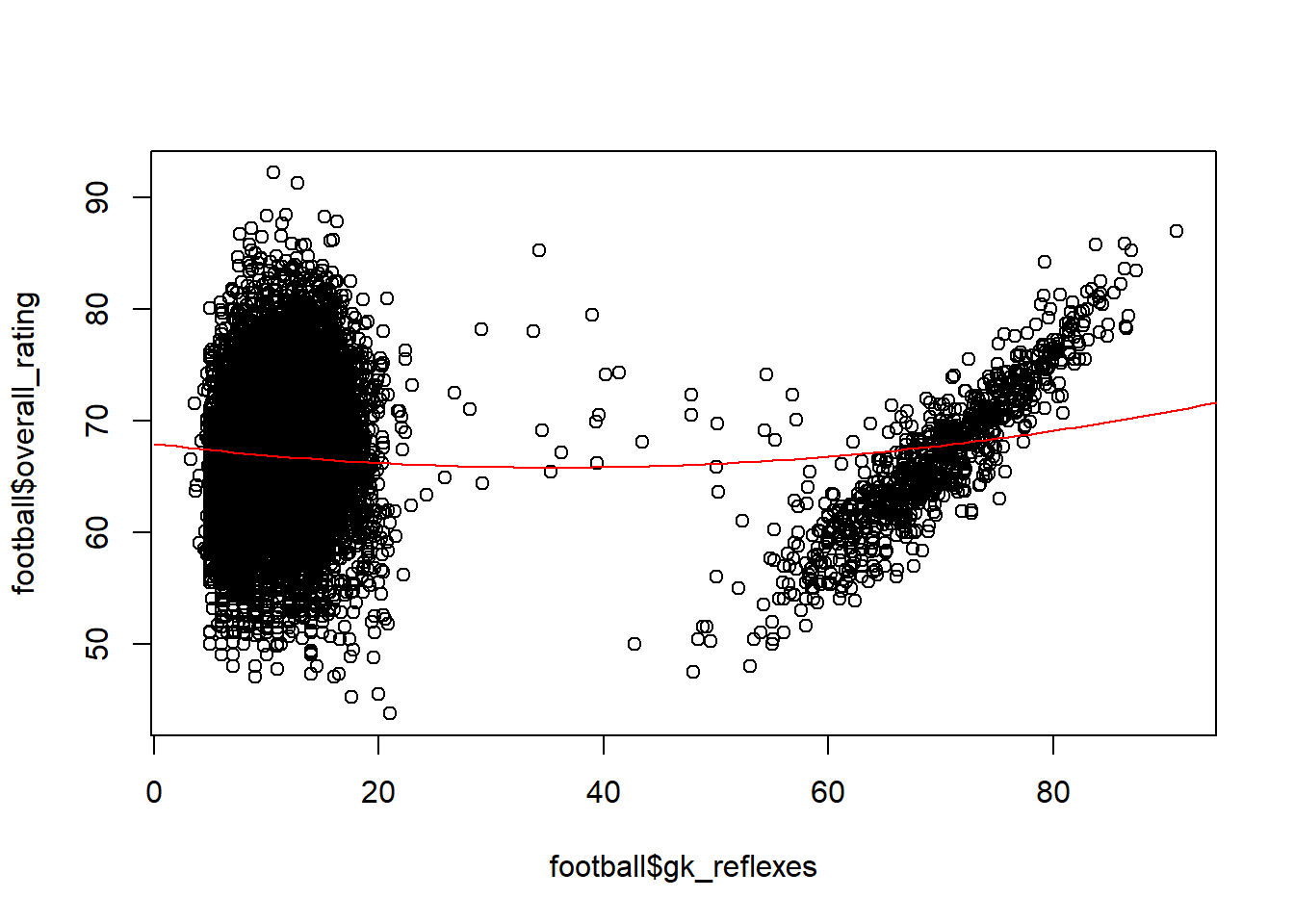 Consider the example below. We have a dataset of football player attributes and their overall rating. When we inspect the relationship between goalkeeper reflexes and overall rating, we get a special non-monotonic relationship. This is because the left hand of the graph represents ‘field players’, for which GK reflexes are of no importance when estimating their overall rating. The right hand side, on the other hand, are actual goal keepers, for which GK reflexes of course is the most important determinant.