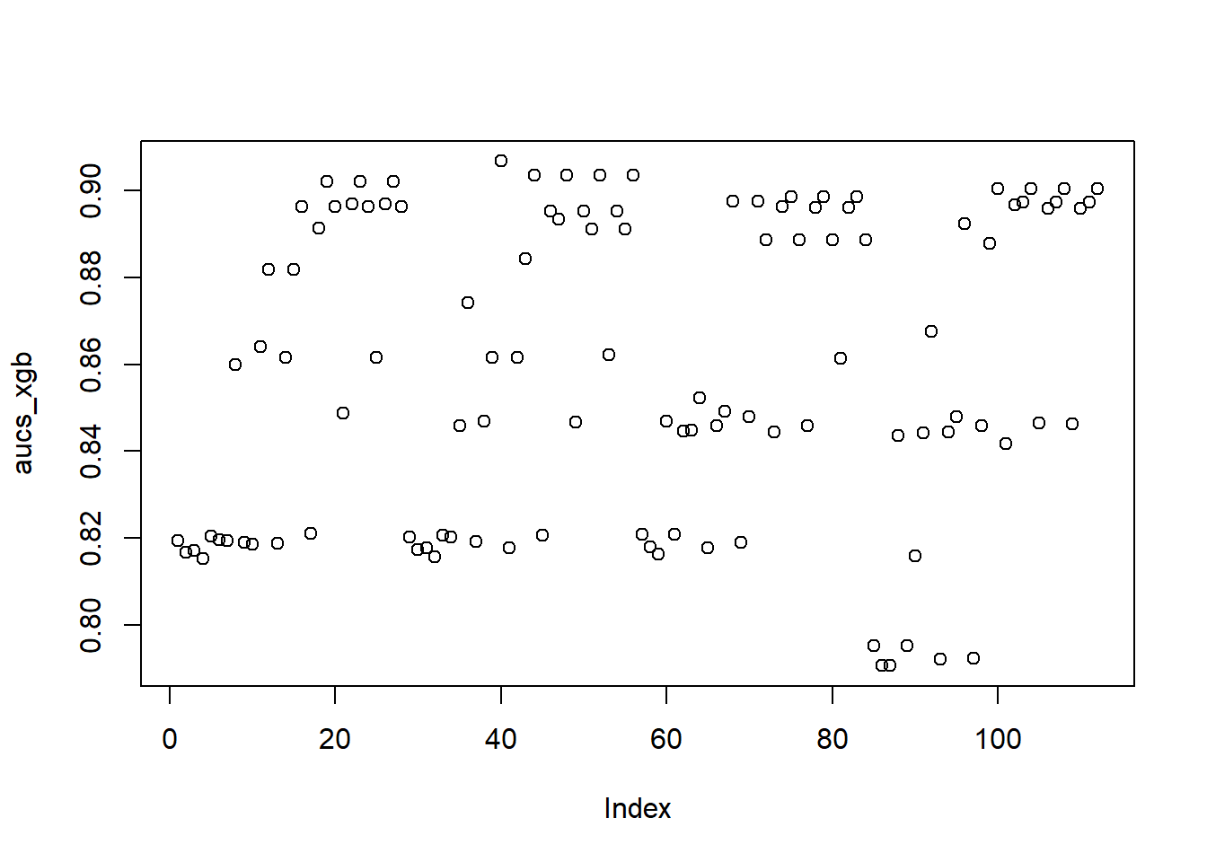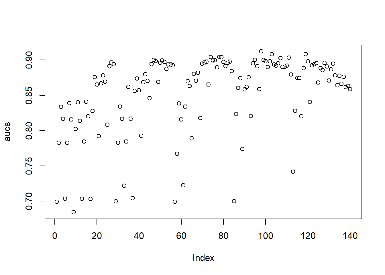aucs[row] <- AUC::auc(AUC::roc(pred, yVAL))