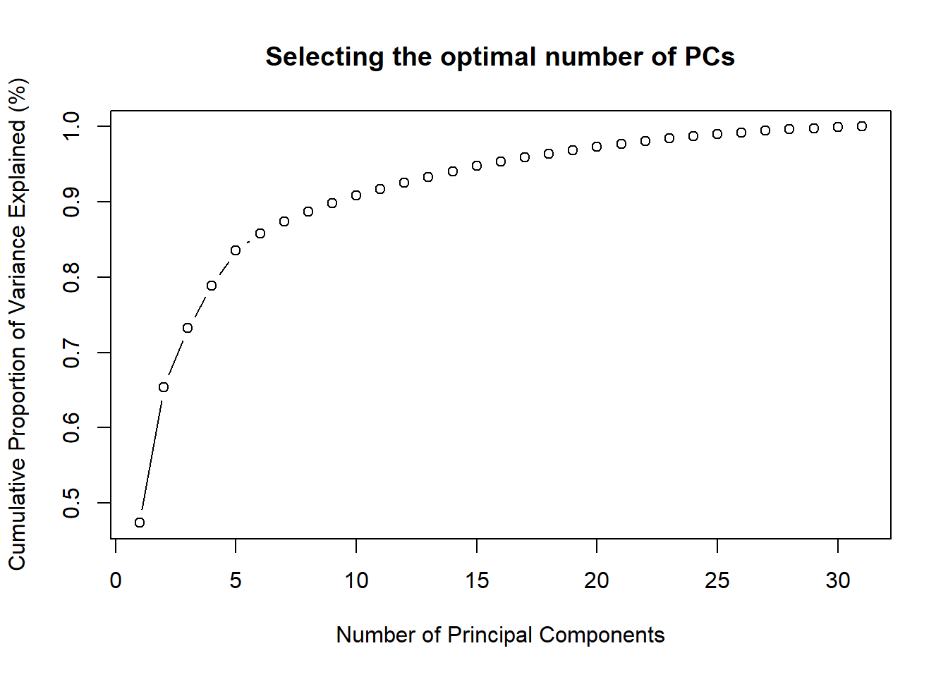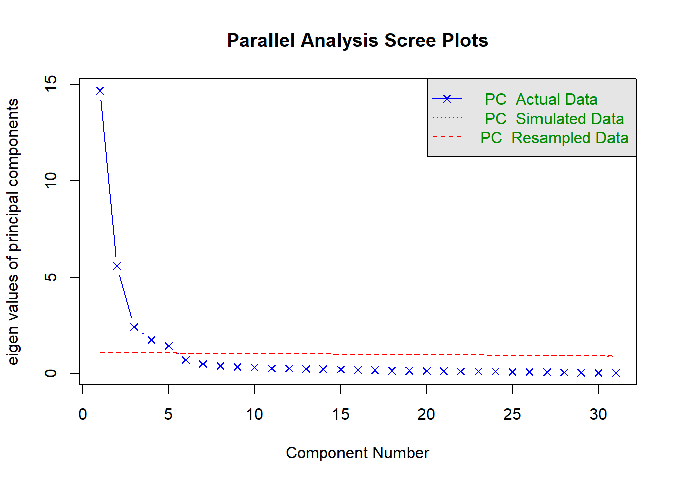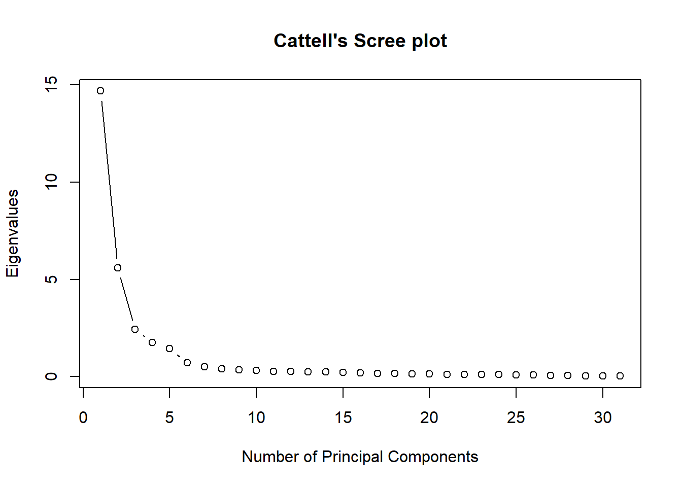 pca <- principal(nums, nfactors = 10, rotate = "none")
