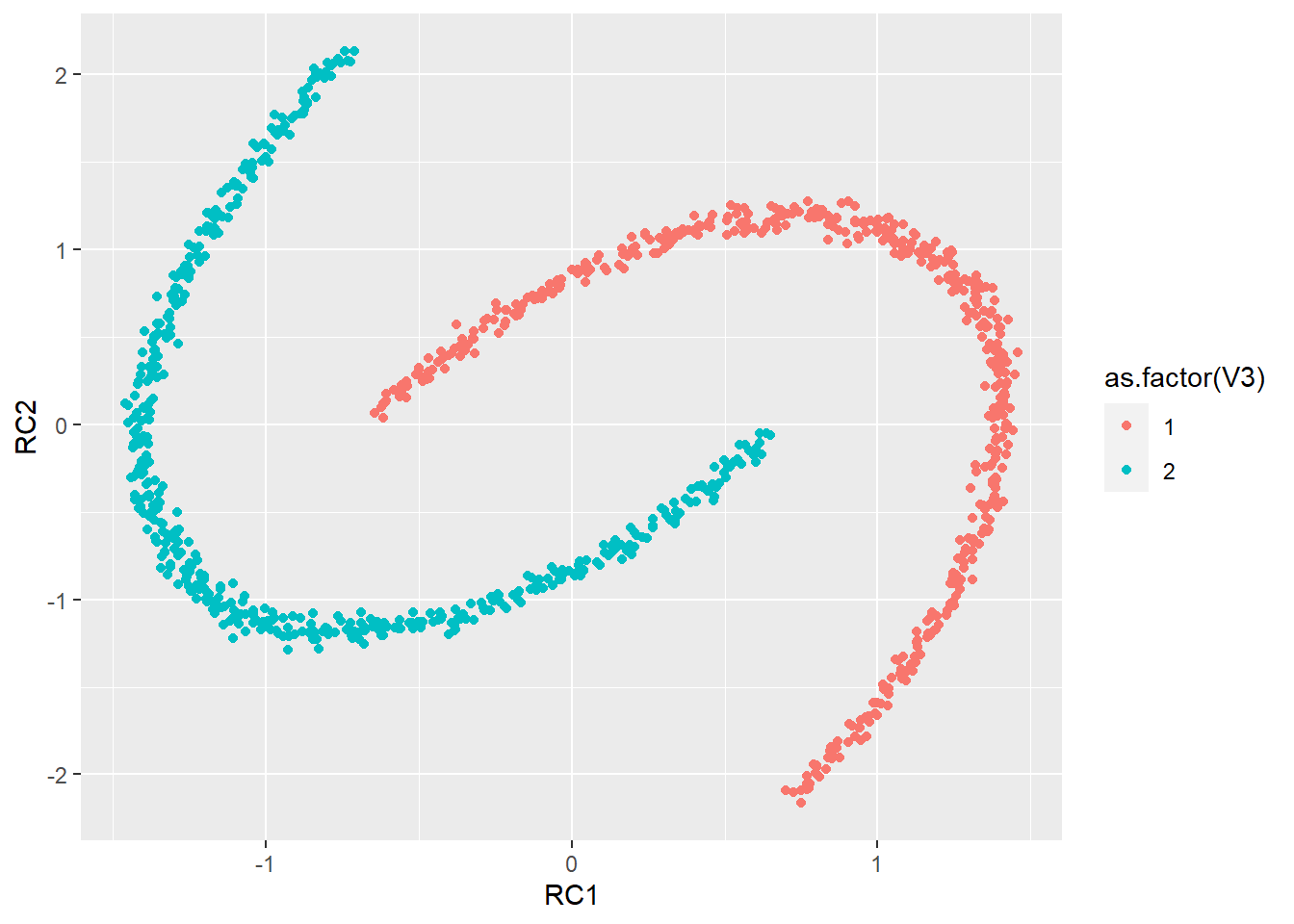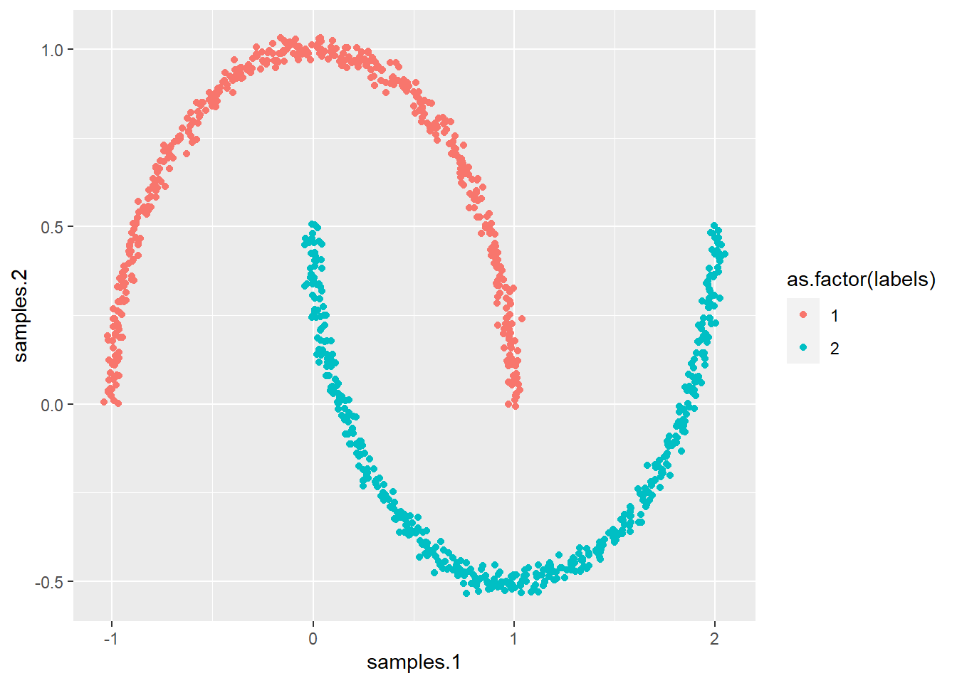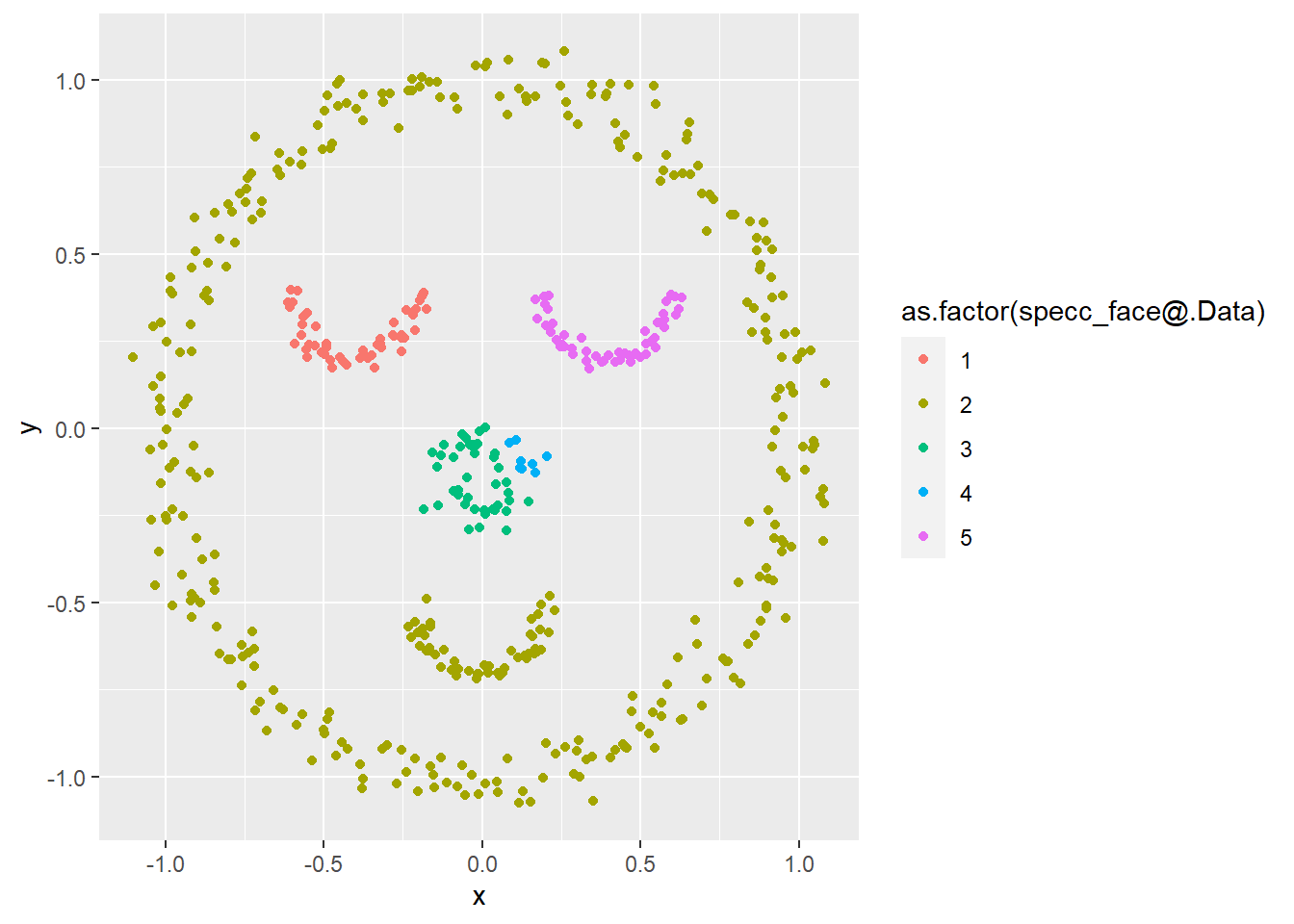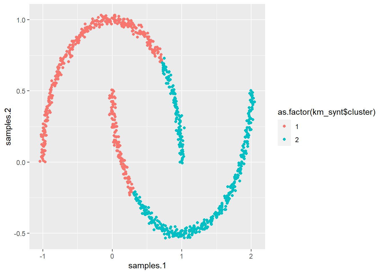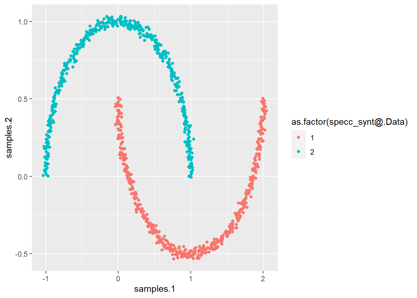 specc_synt <- specc(x = data.matrix(synt[, 1:2]), centers = 2,