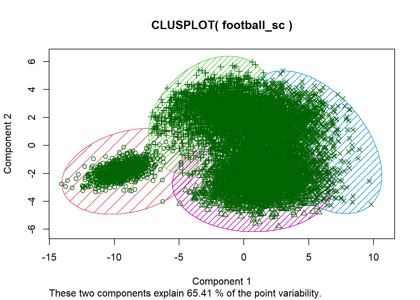 fviz_cluster(list(data = football_sc, cluster = kms[[1]]$cluster),
