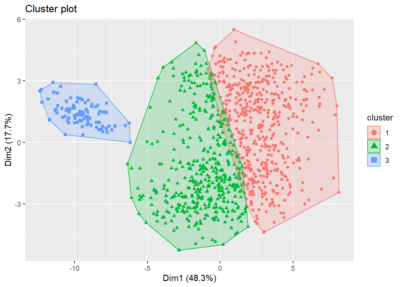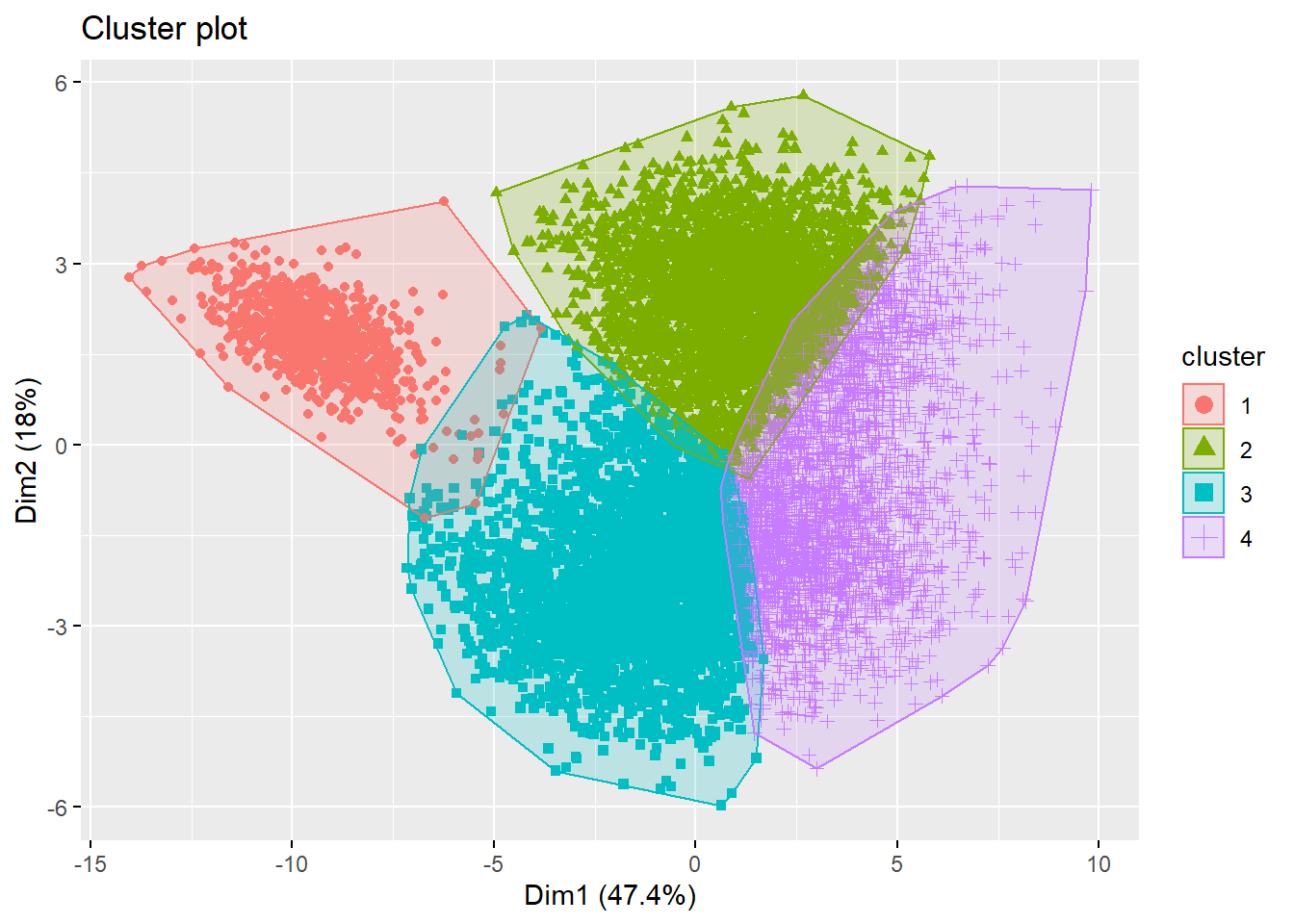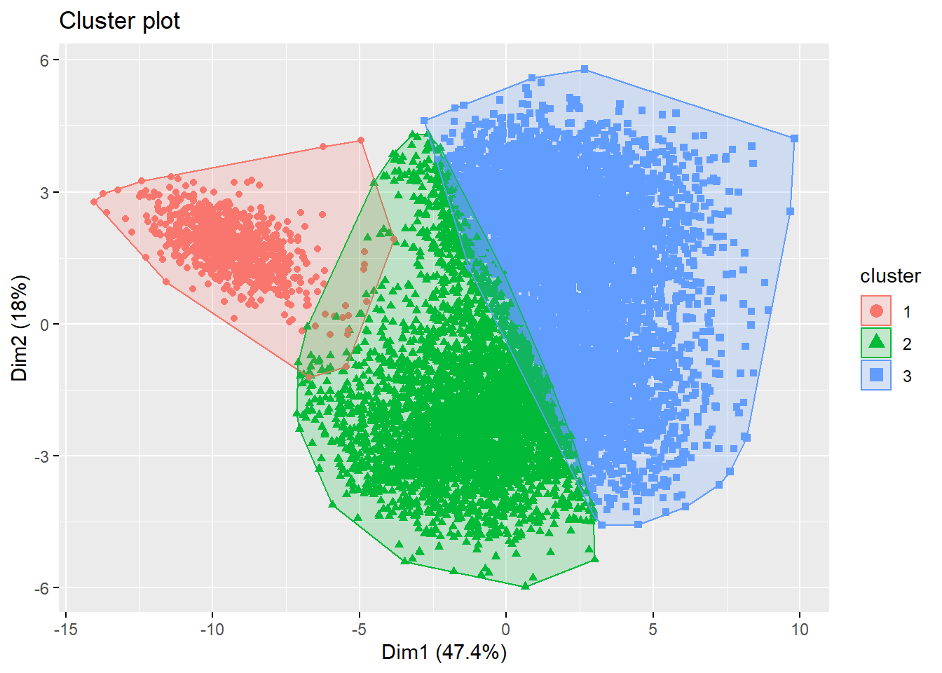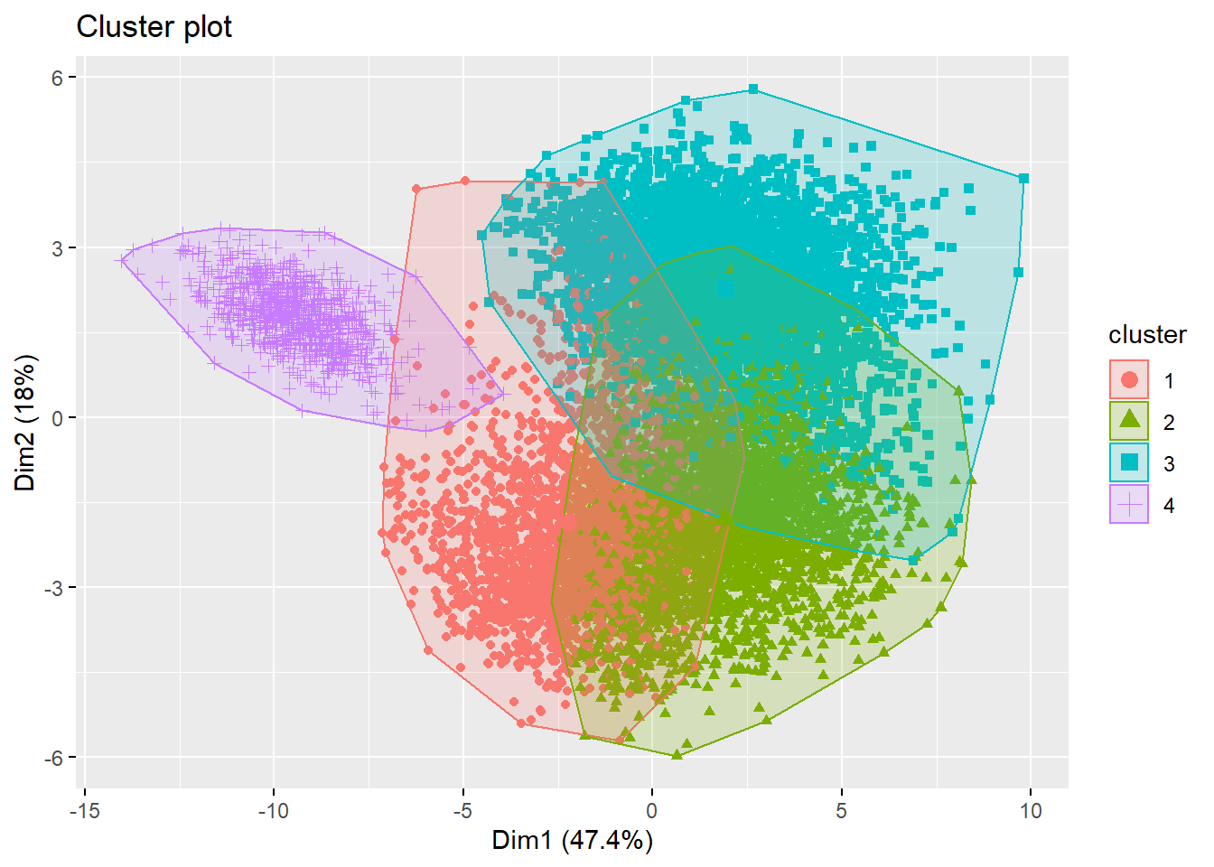 # 'convex' )Some may have experienced issues due to limited working memory (Error: cannot allocate vector of size …). This can be countered by fitting your clusters on a more limited sample size as is done in the example below (with 1000 samples). Note that the determination of optimal number of clusters with the NbClust method was also based on a limited sample size.