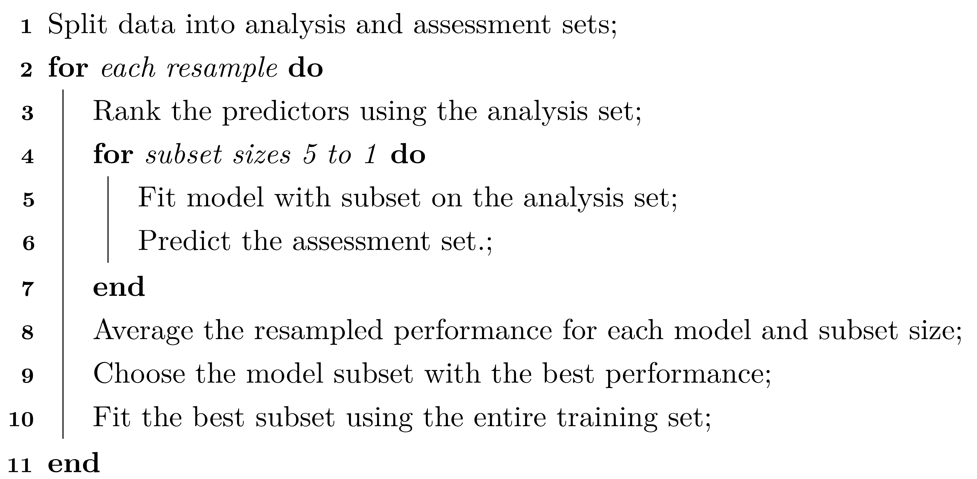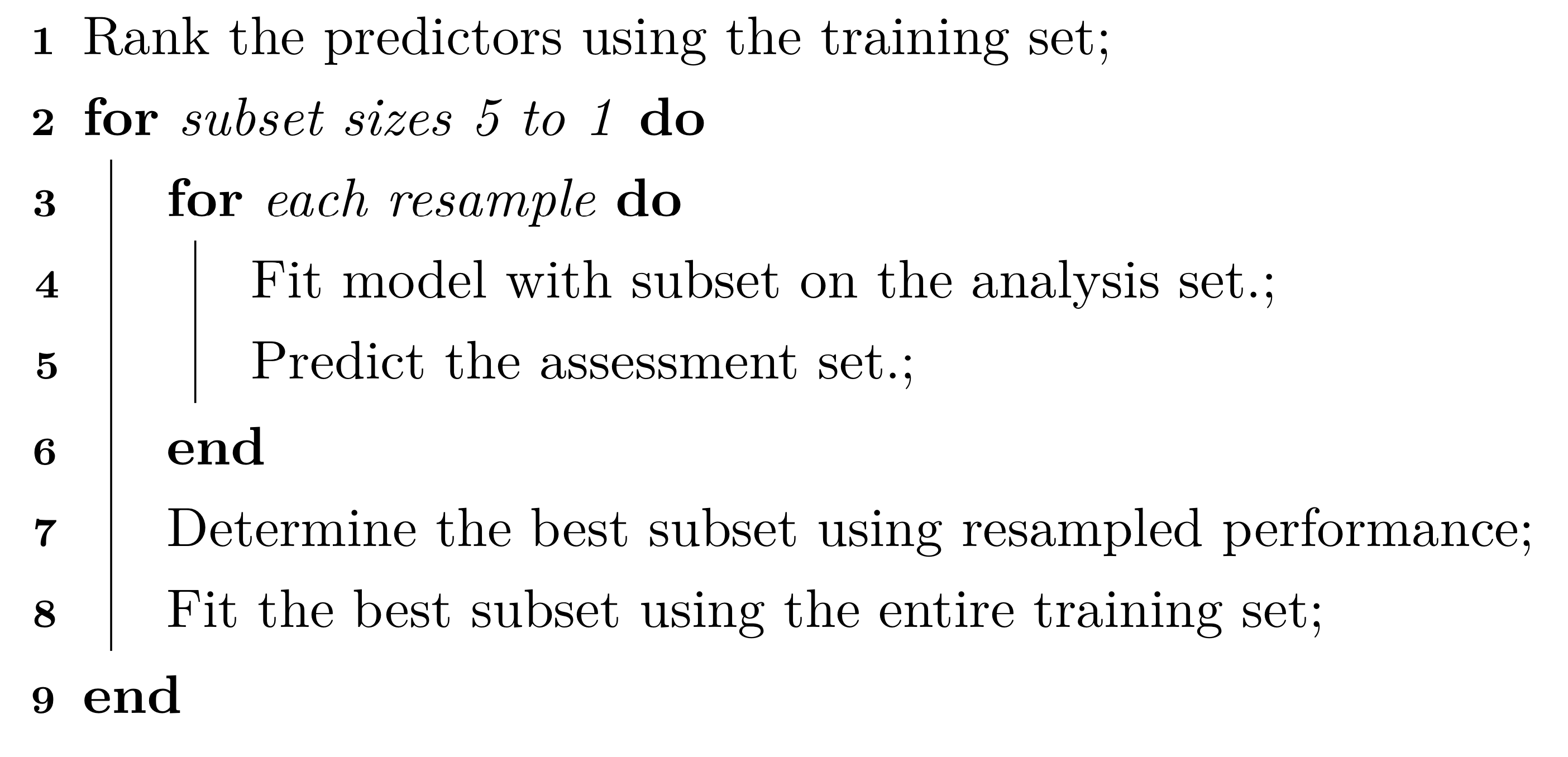 A better way of combining feature selection and resampling is to make feature selection a component of the modeling process. Feature selection should be incorporated the same way as preprocessing and other engineering tasks. What we mean is that that an appropriate way to perform feature selection is to do this inside of the resampling process81. Using the previous example with five predictors the algorithm for feature selection within resampling is modified to: