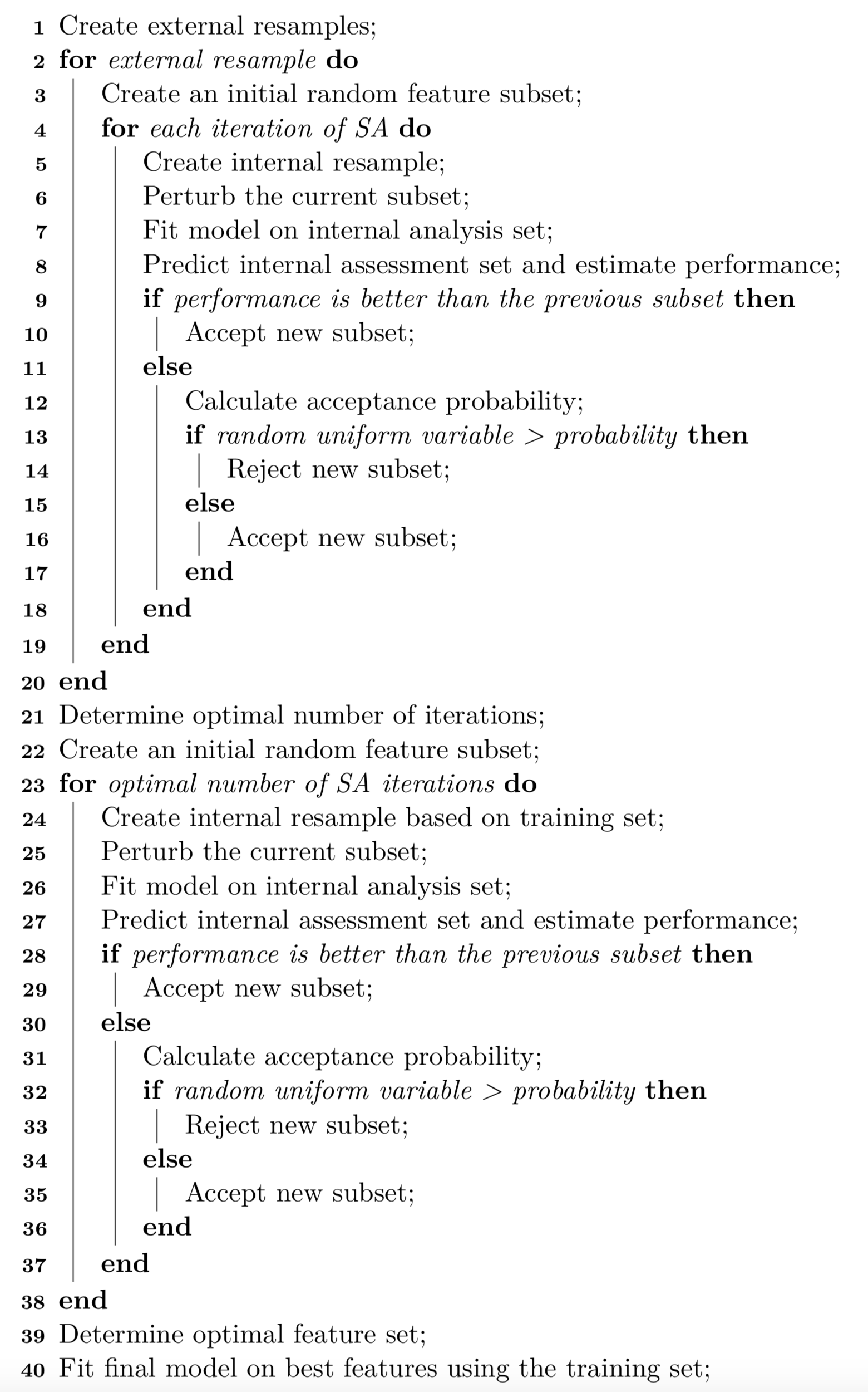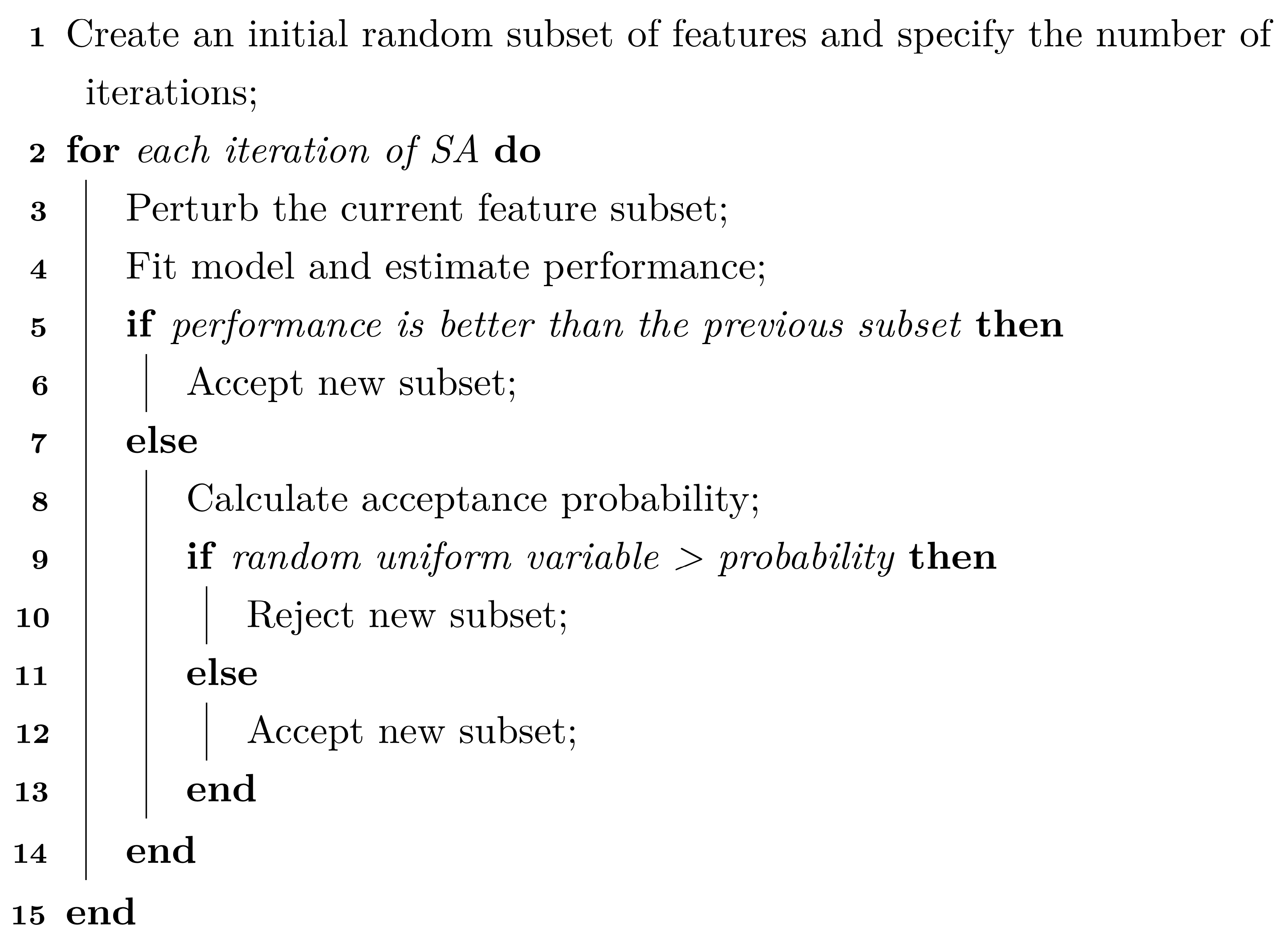 This algorithm summarizes the basic simulated annealing algorithm for feature selection: