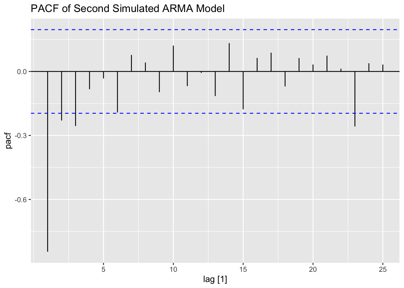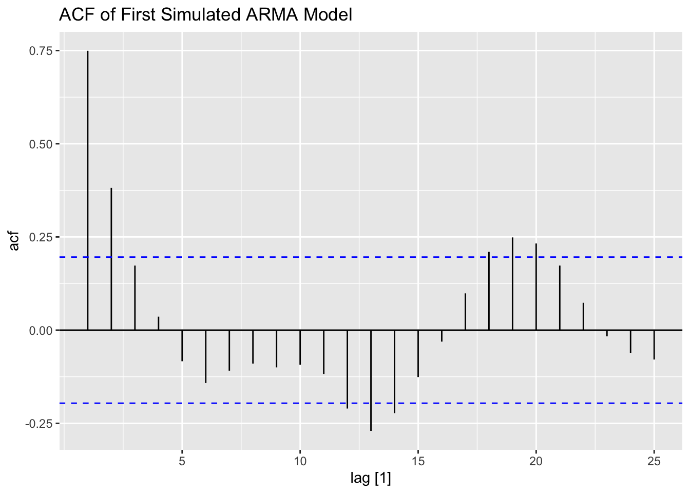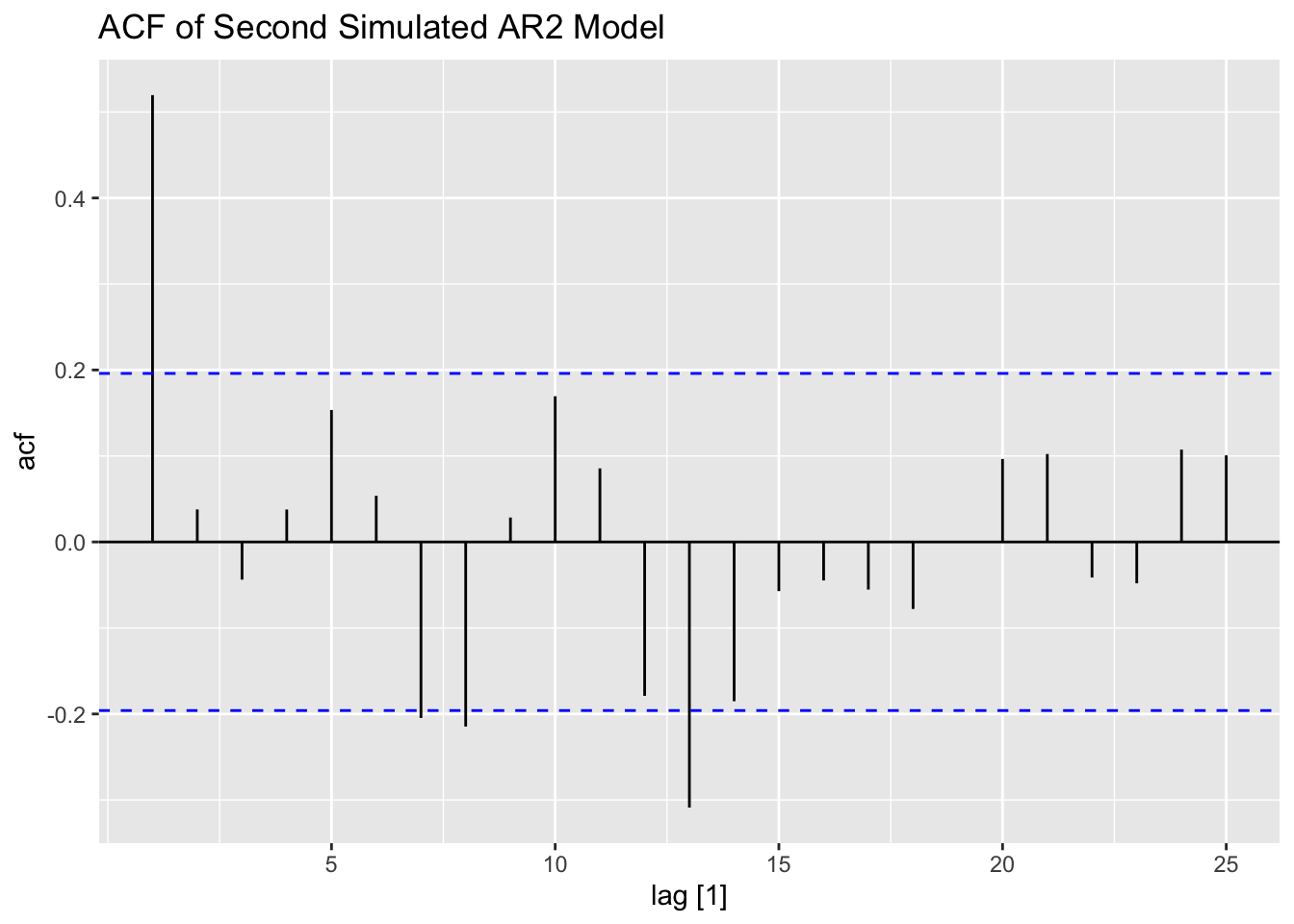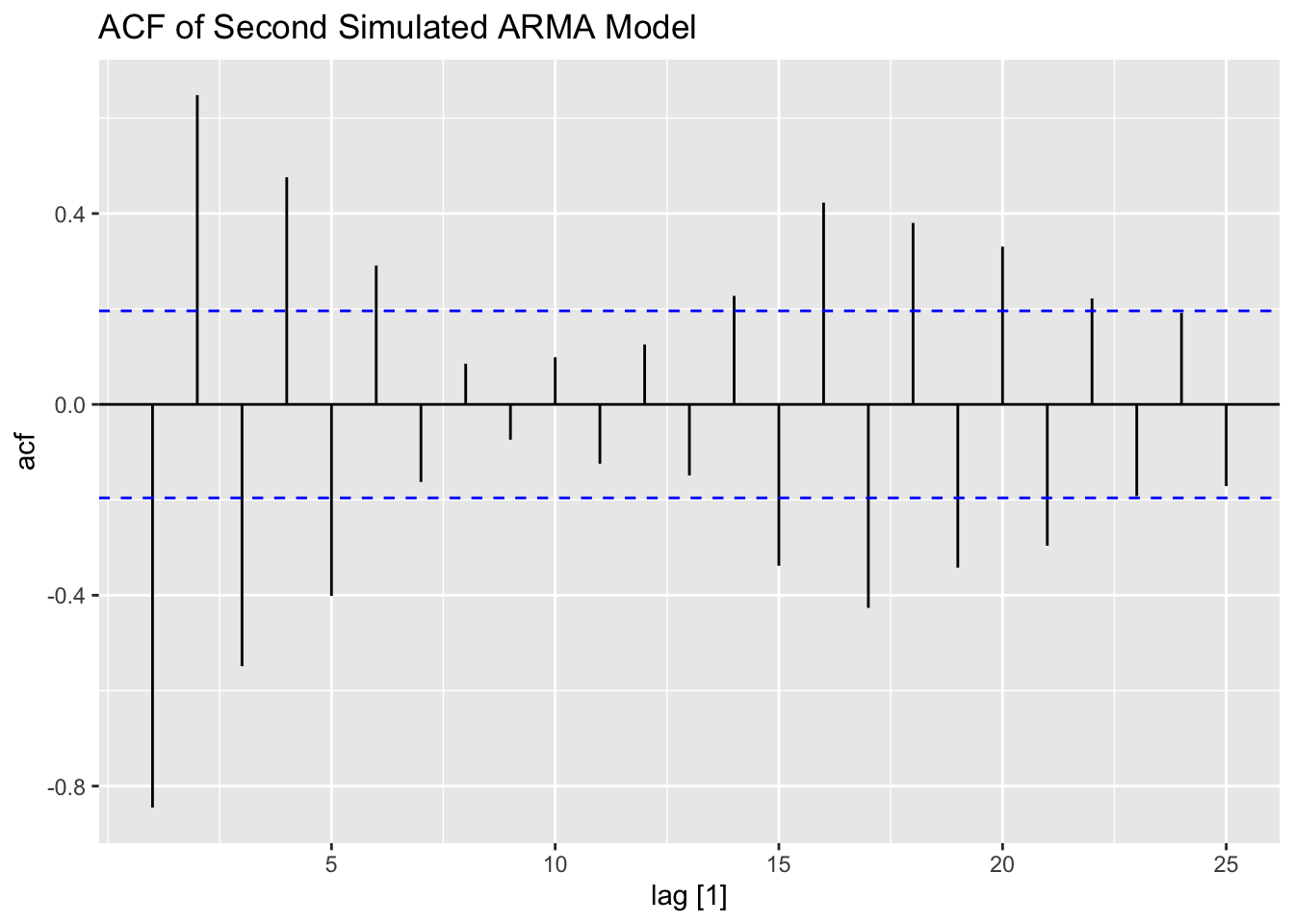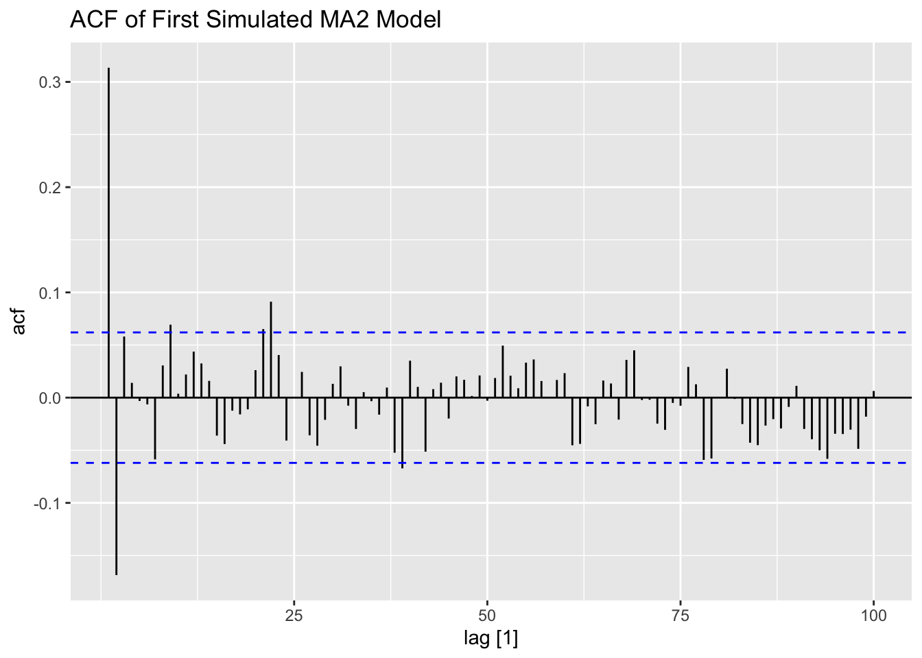 Note: the ACF of a \(MA(q)\) model “cuts off” after lag ‘q’ [or becomes very small in absolute value after lag ‘q’].