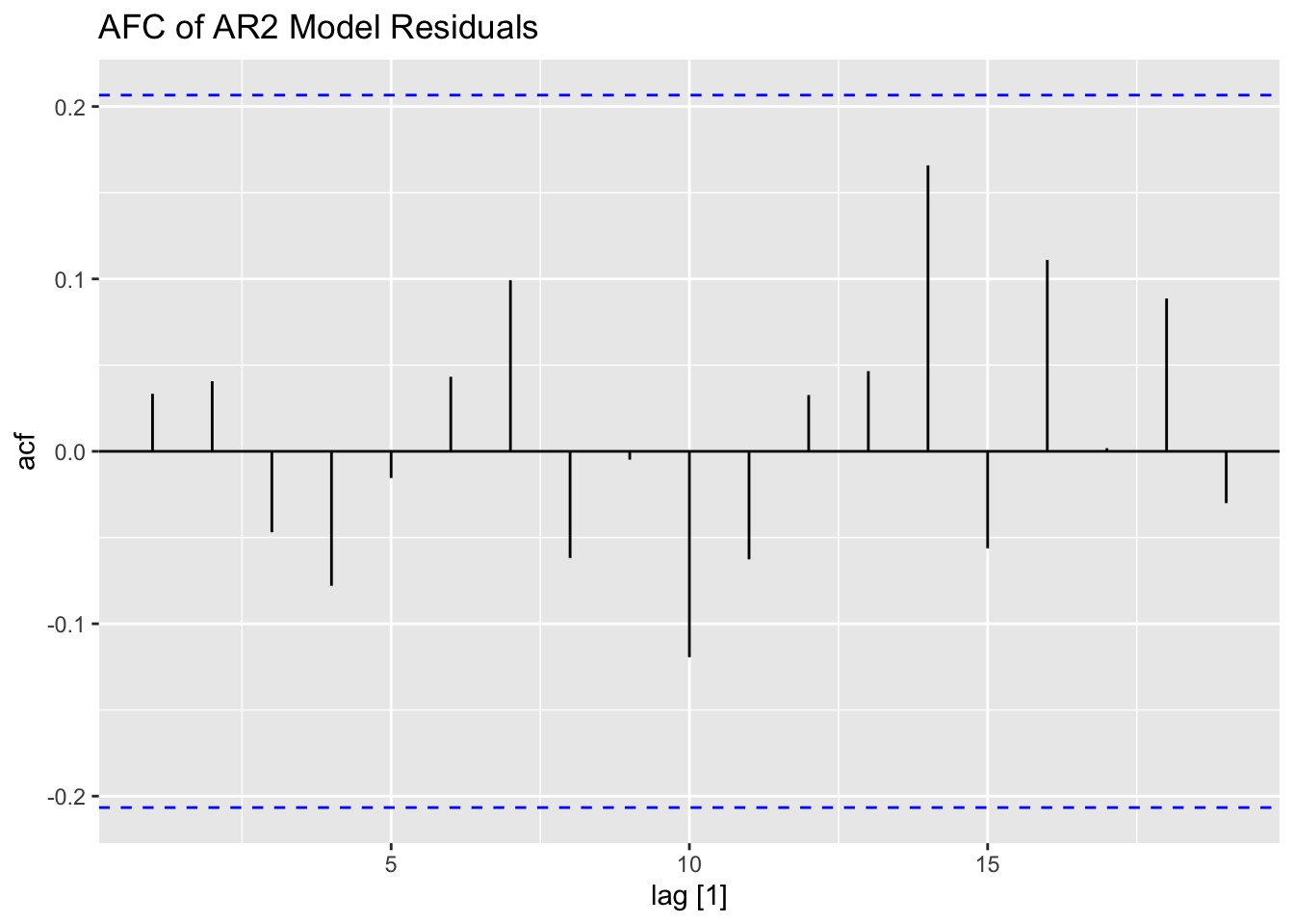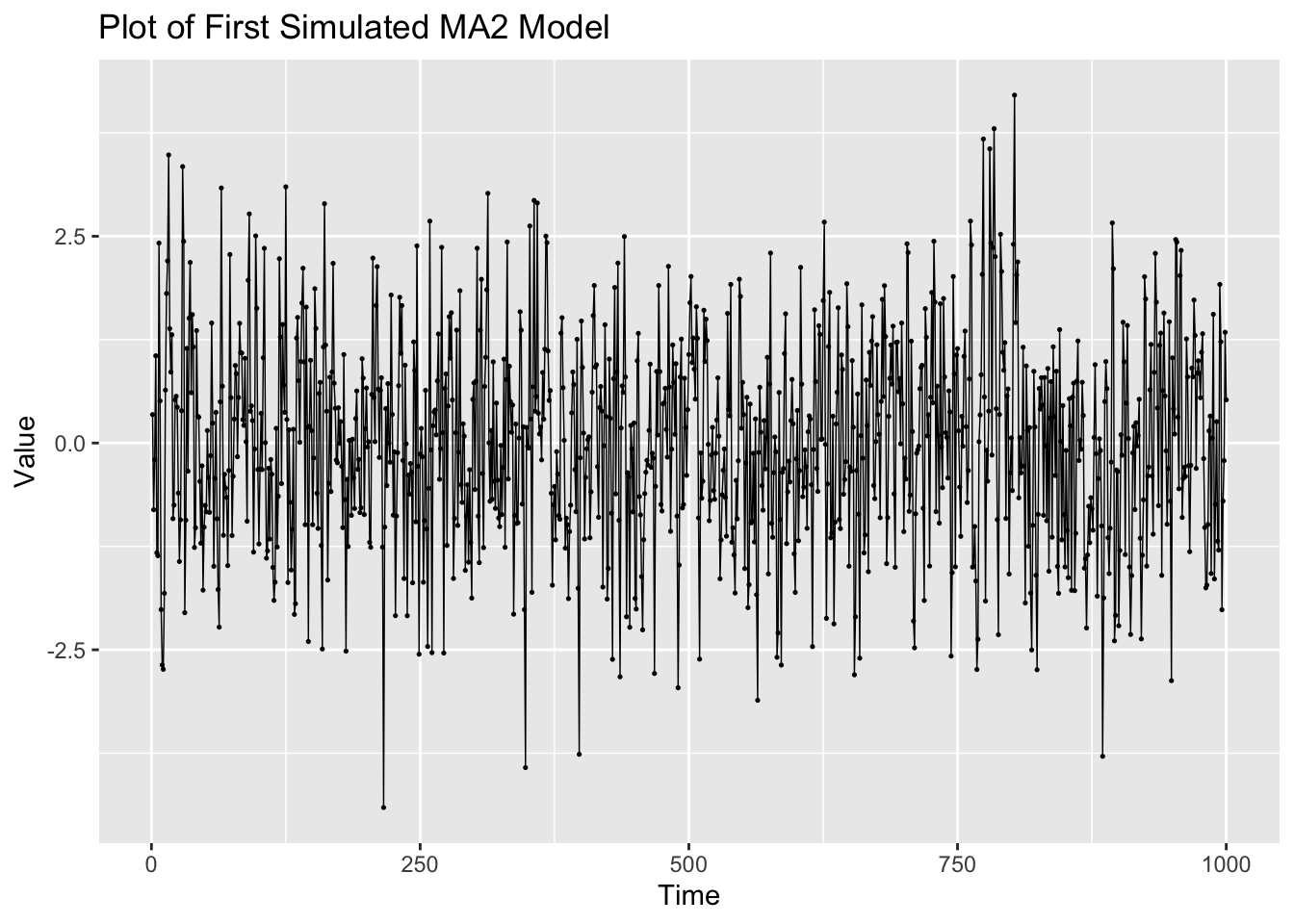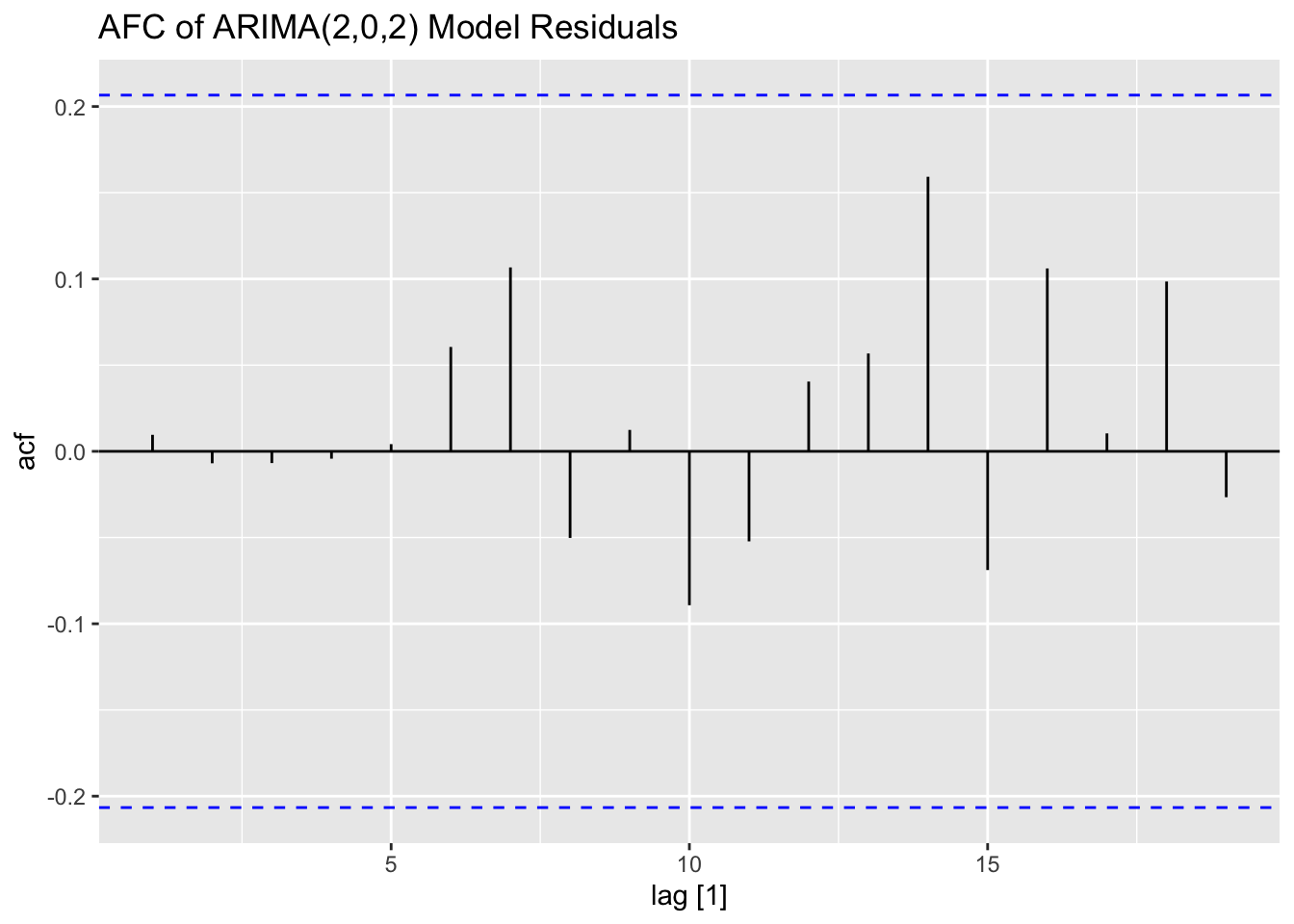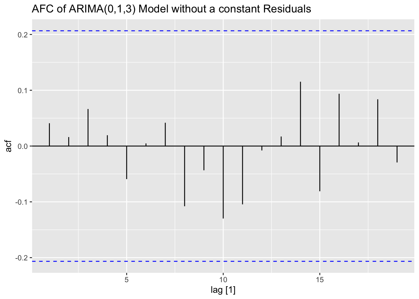 Note: the ACF of a \(MA(q)\) model “cuts off” after lag ‘q’ [or becomes very small in absolute value after lag ‘q’].