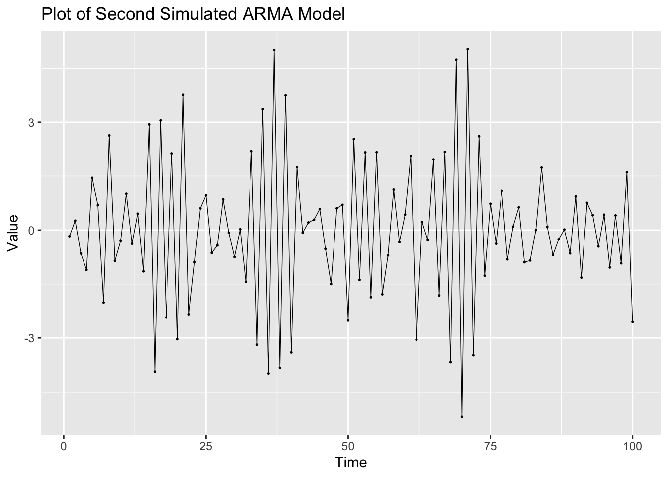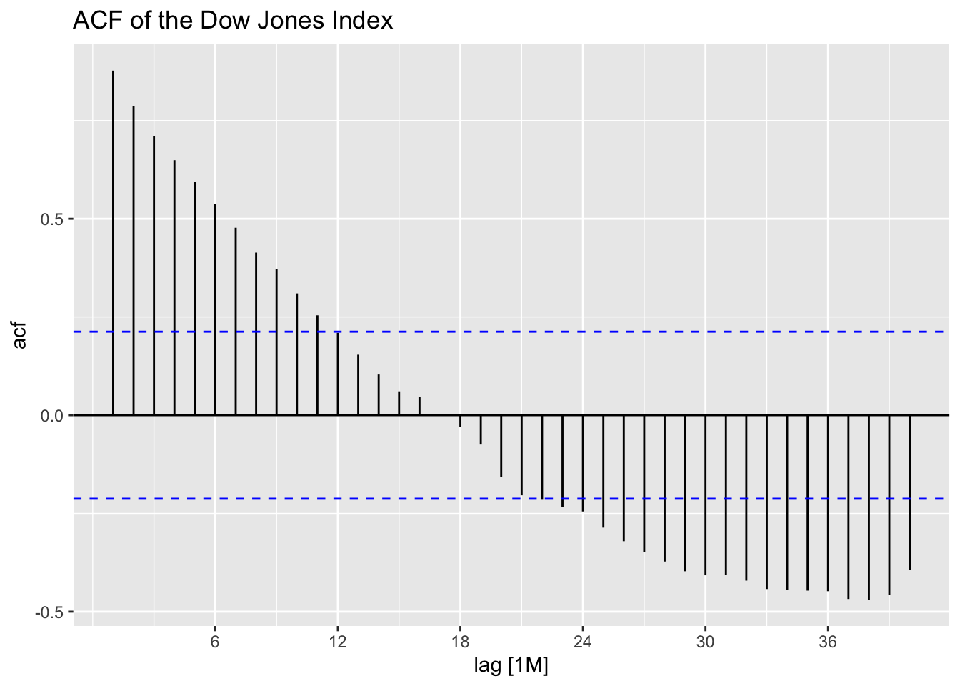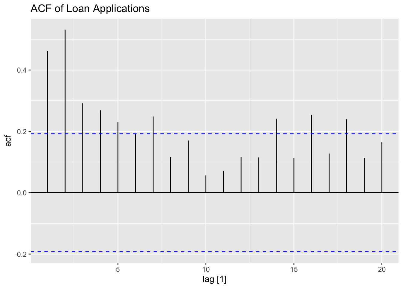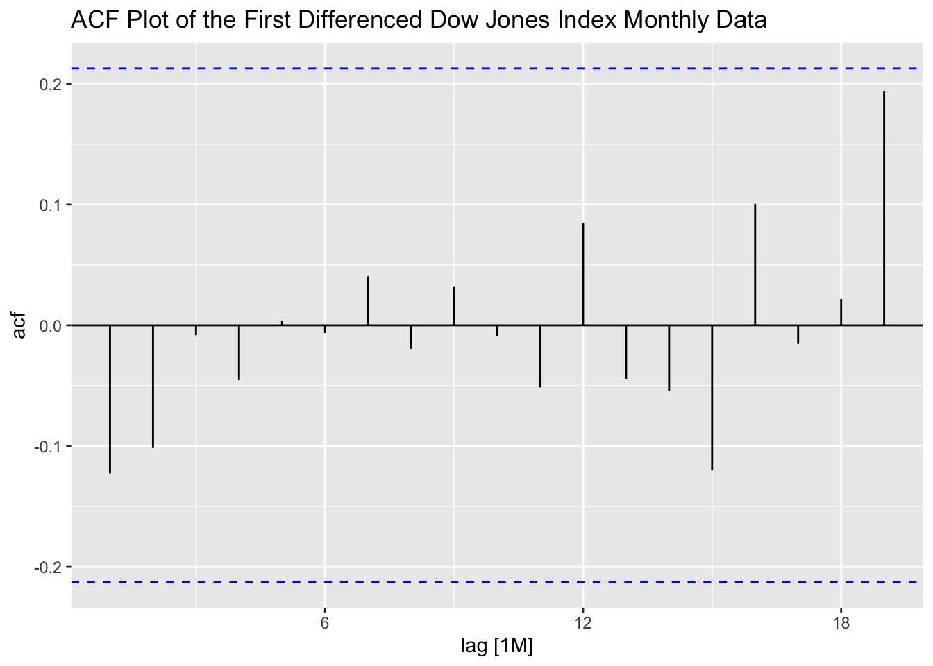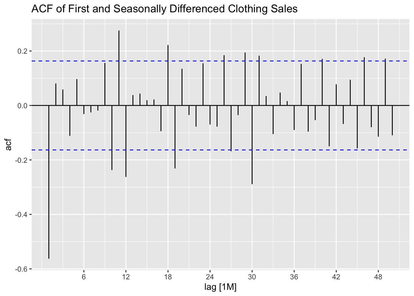Note: the ACF of a \(MA(q)\) model “cuts off” after lag ‘q’ [or becomes very small in absolute value after lag ‘q’].