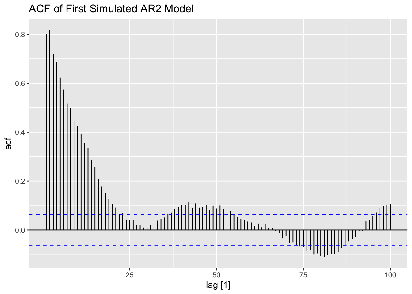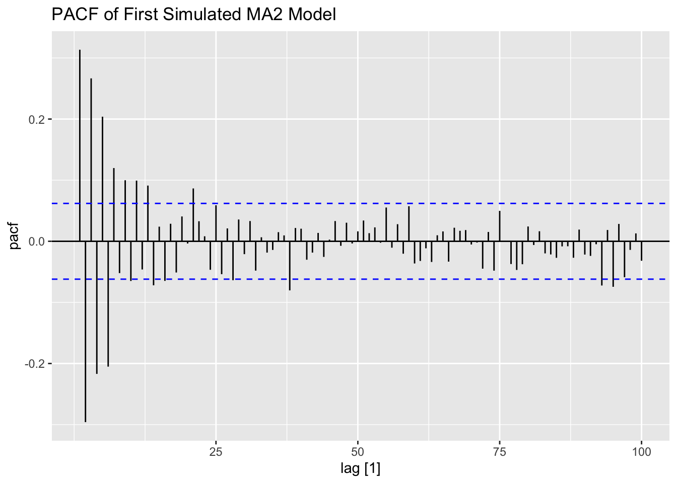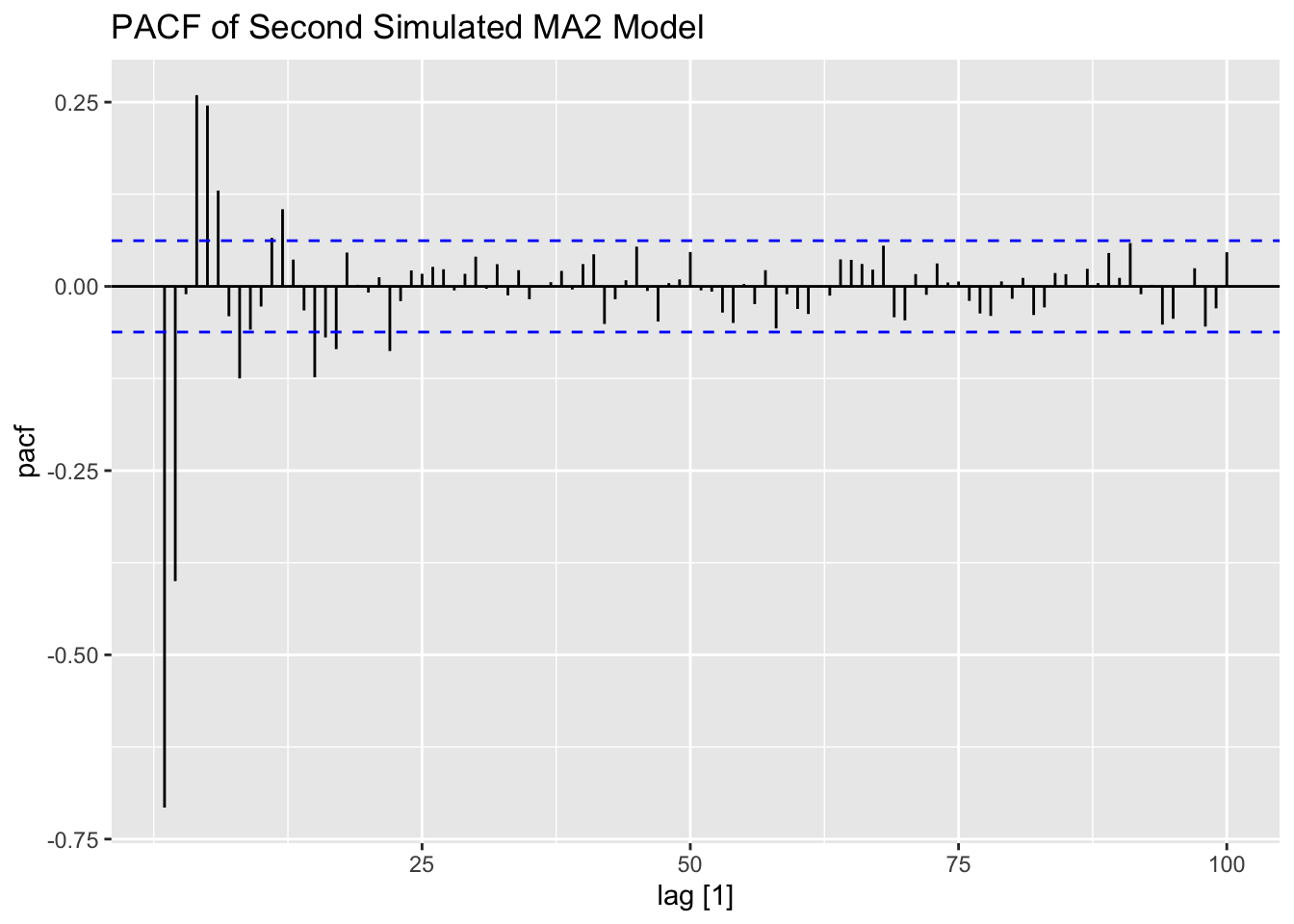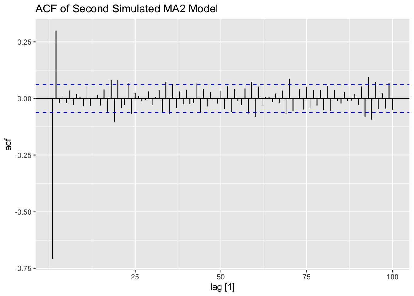 Note that the ACF for an \(MA(2)\) process cuts off after lag 2.