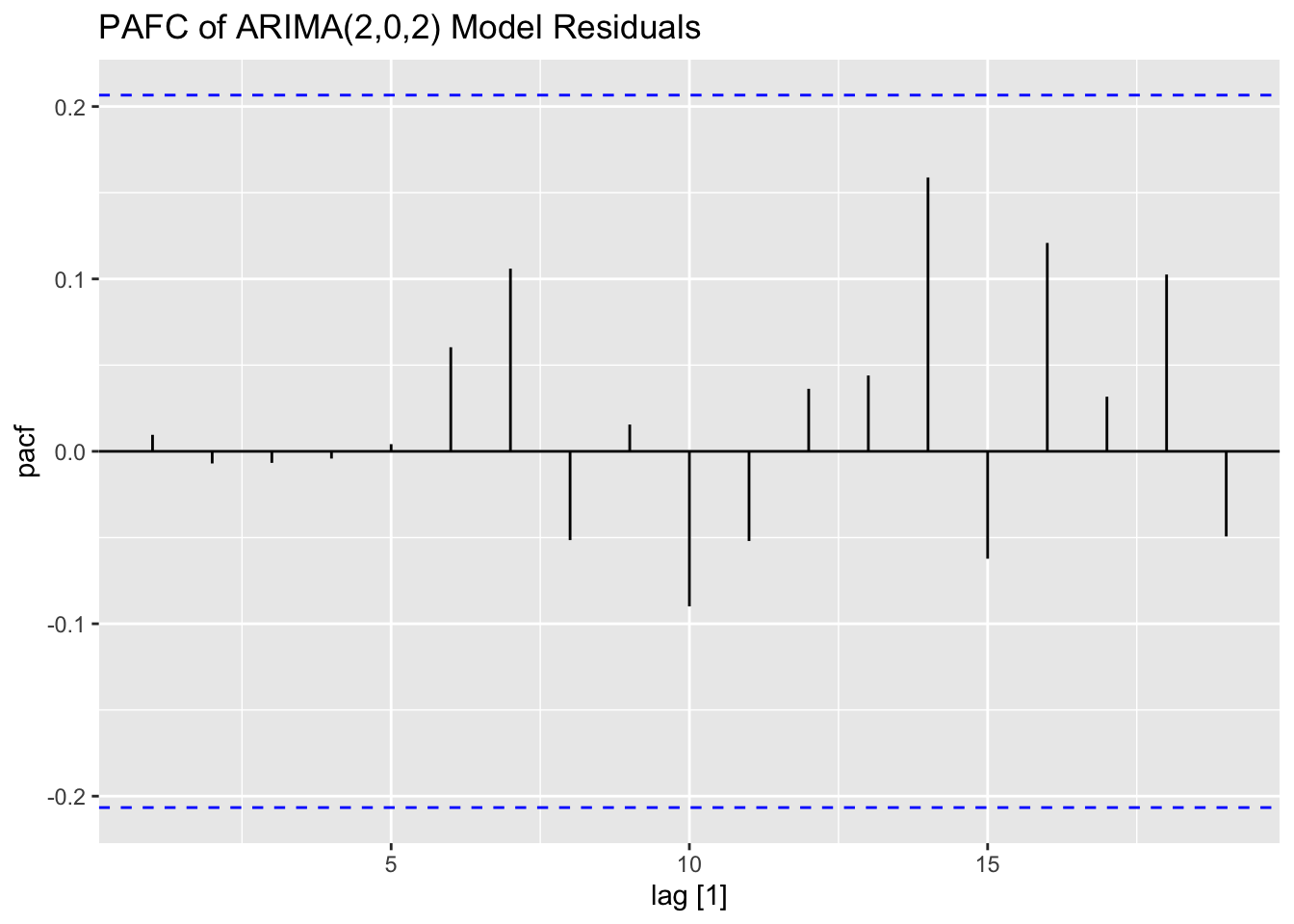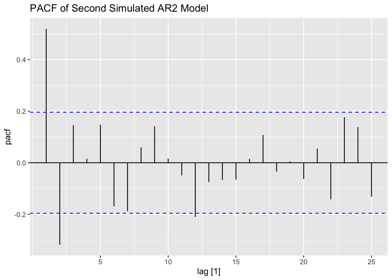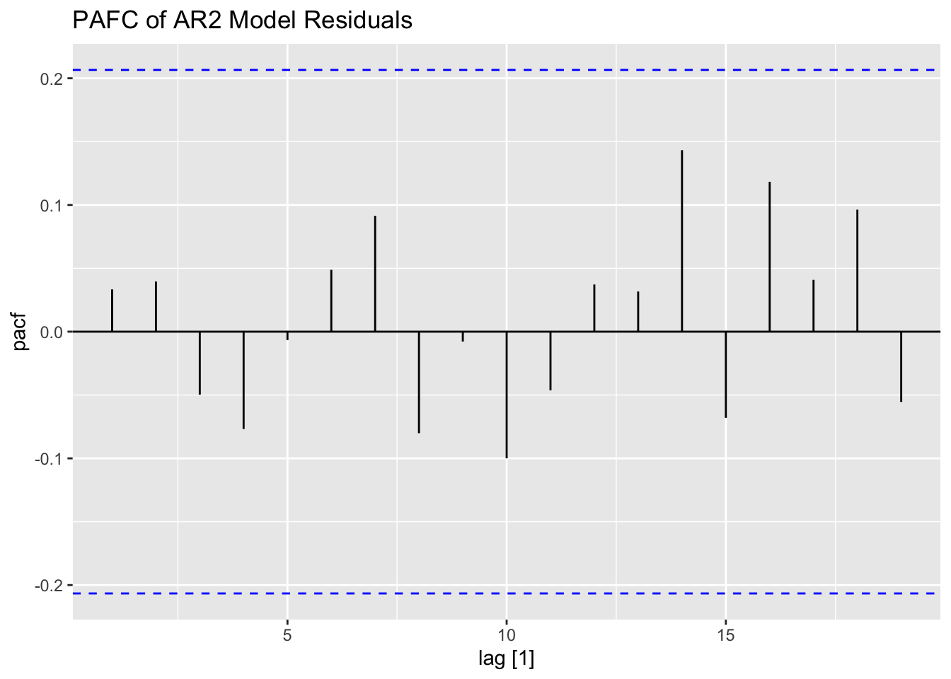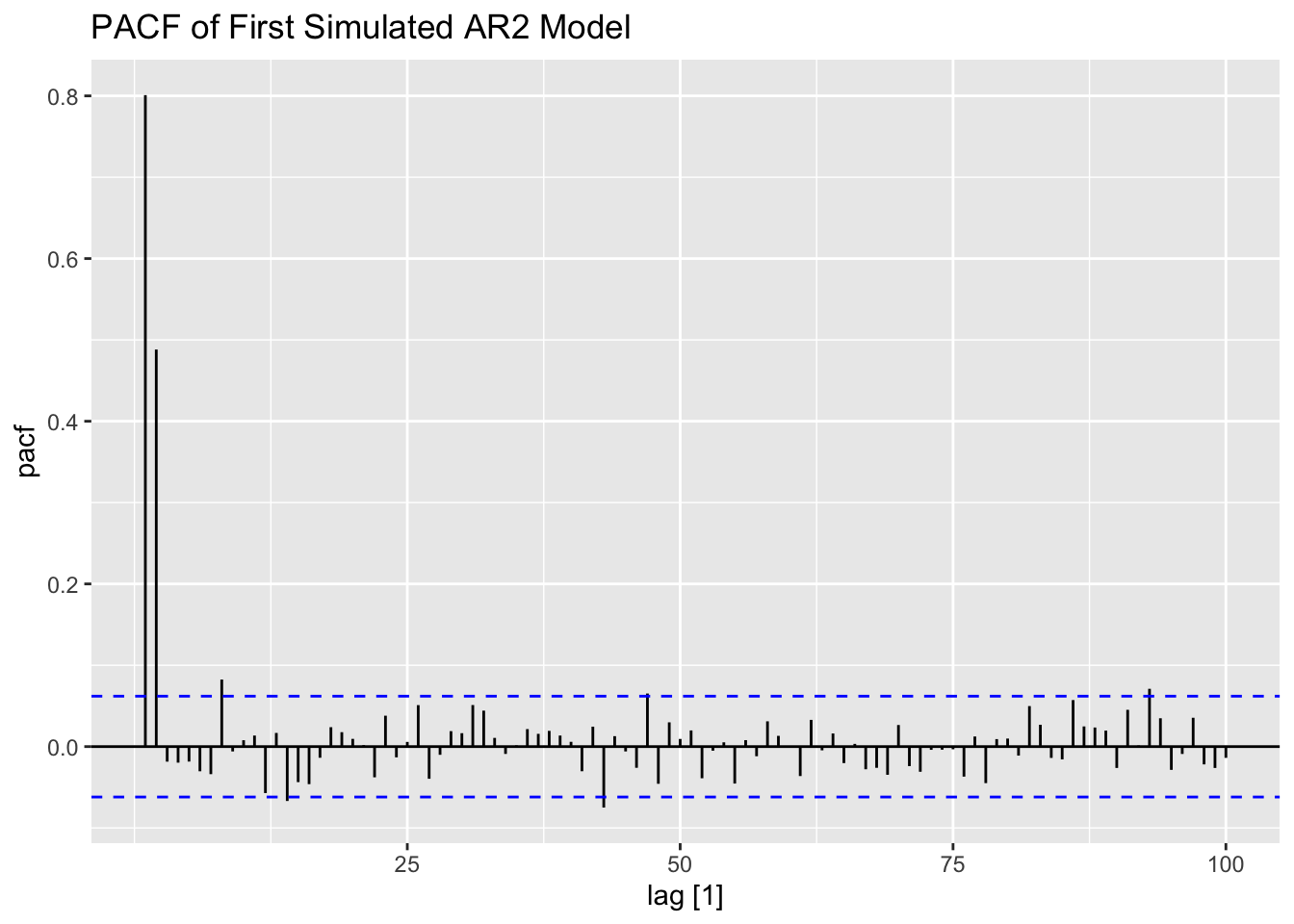 Thus, for an AR(p) model, the PACF between \(y_{t}\) and \(y_{t-k}\) should be zero for all \(k>p\).