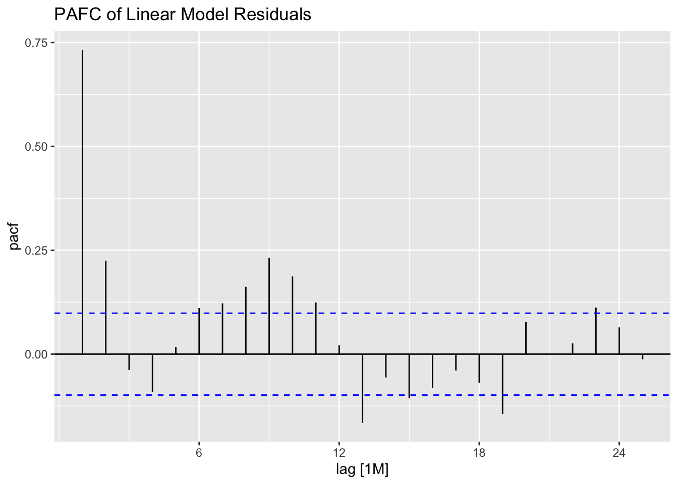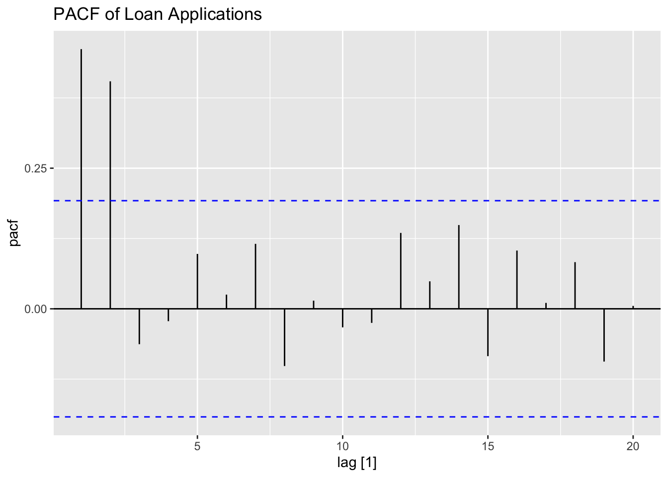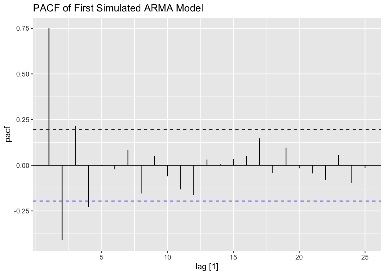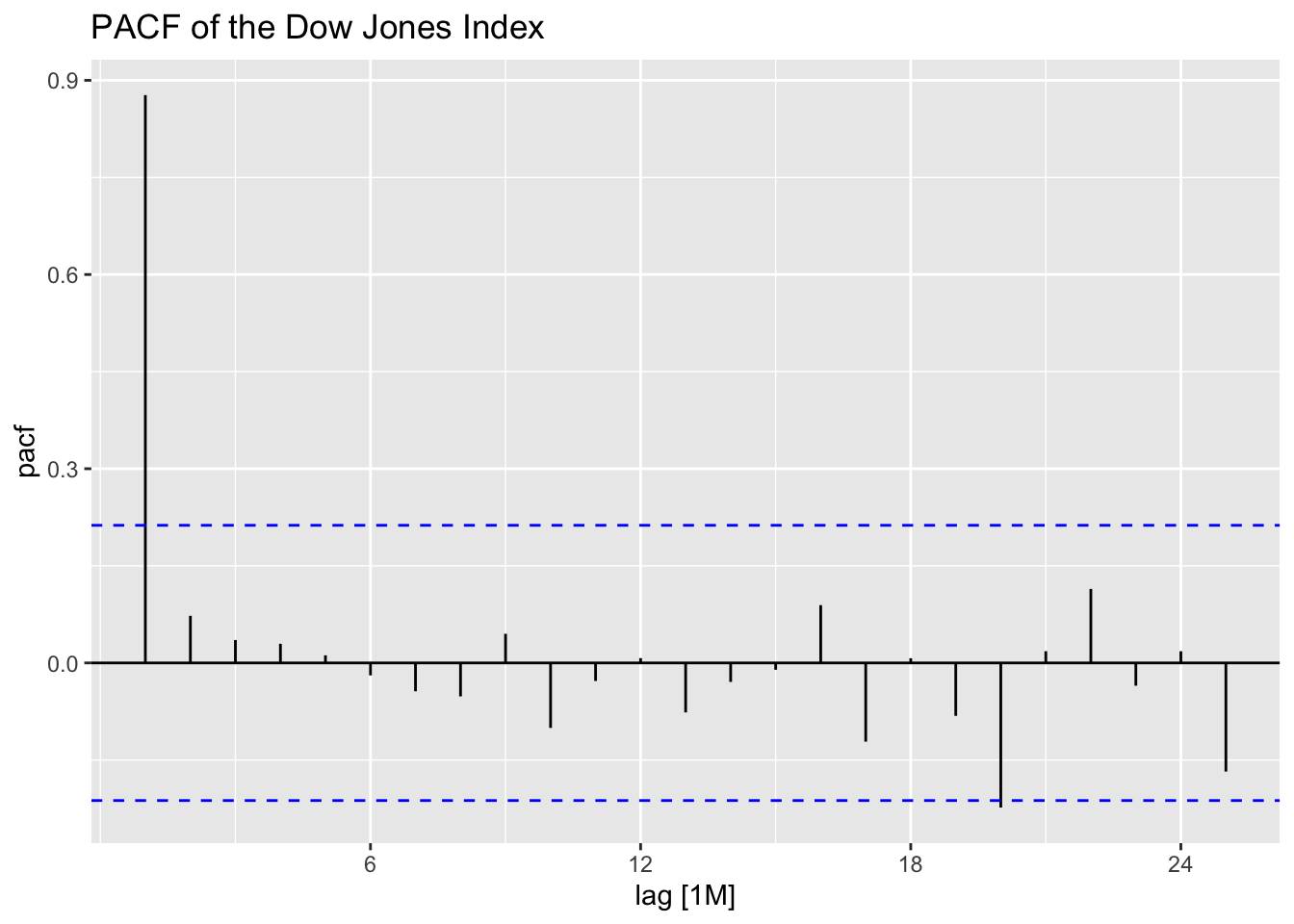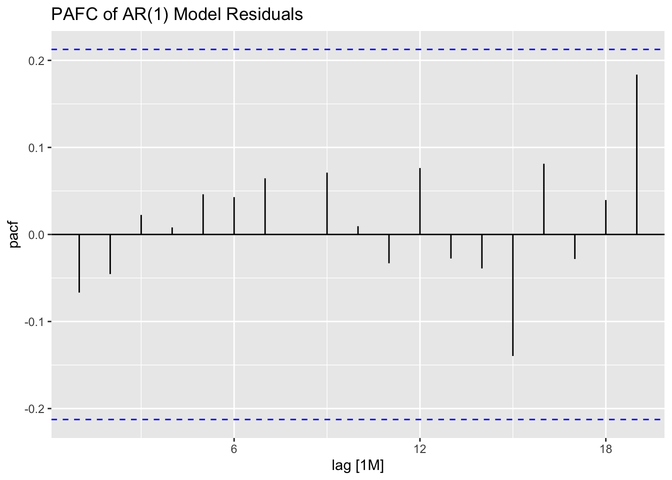 Thus, for an AR(p) model, the PACF between \(y_{t}\) and \(y_{t-k}\) should be zero for all \(k>p\).