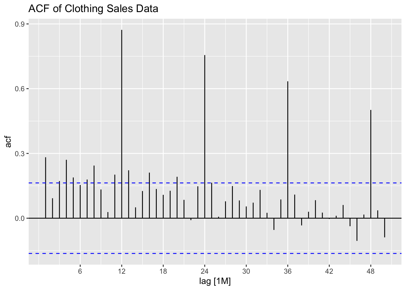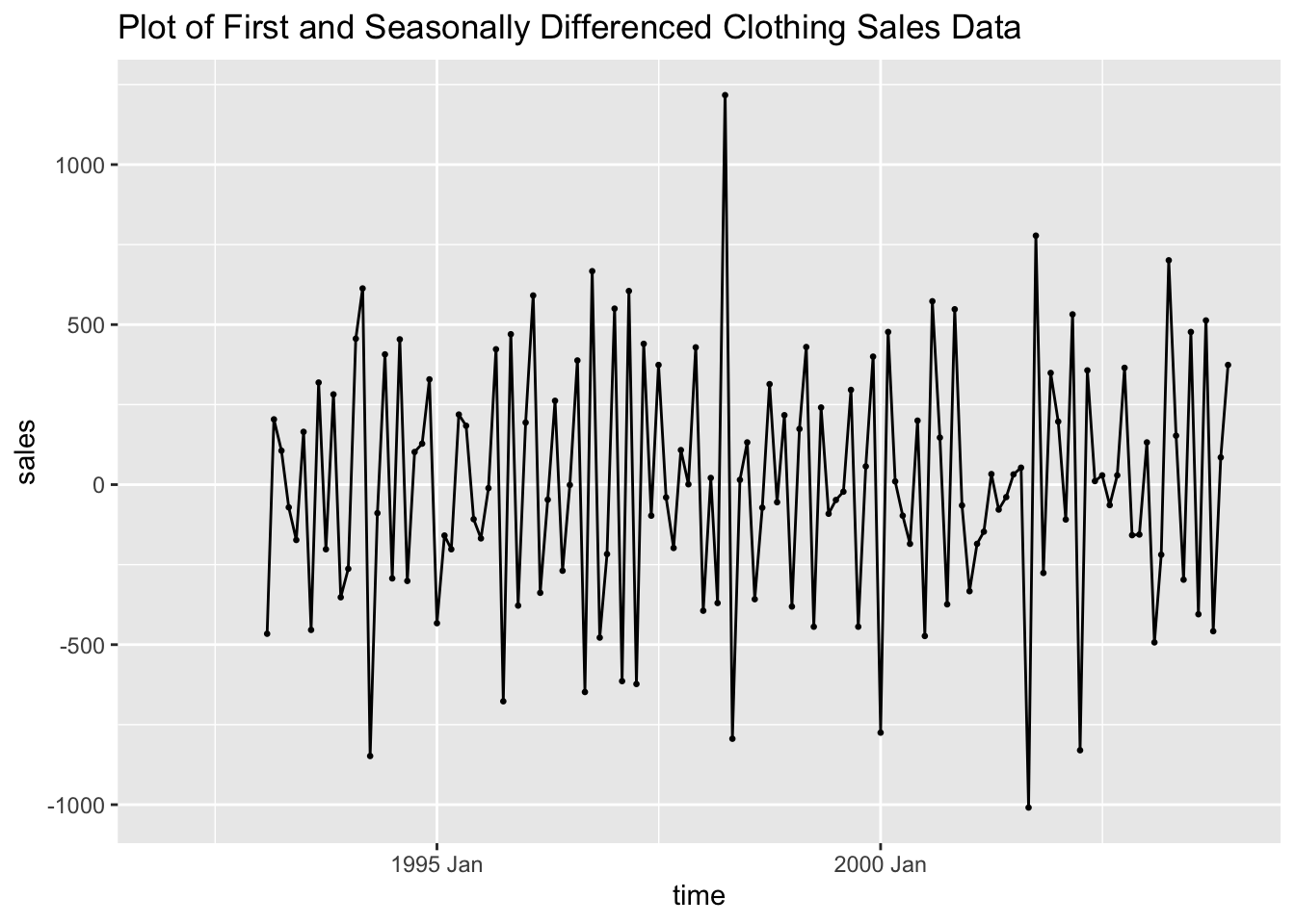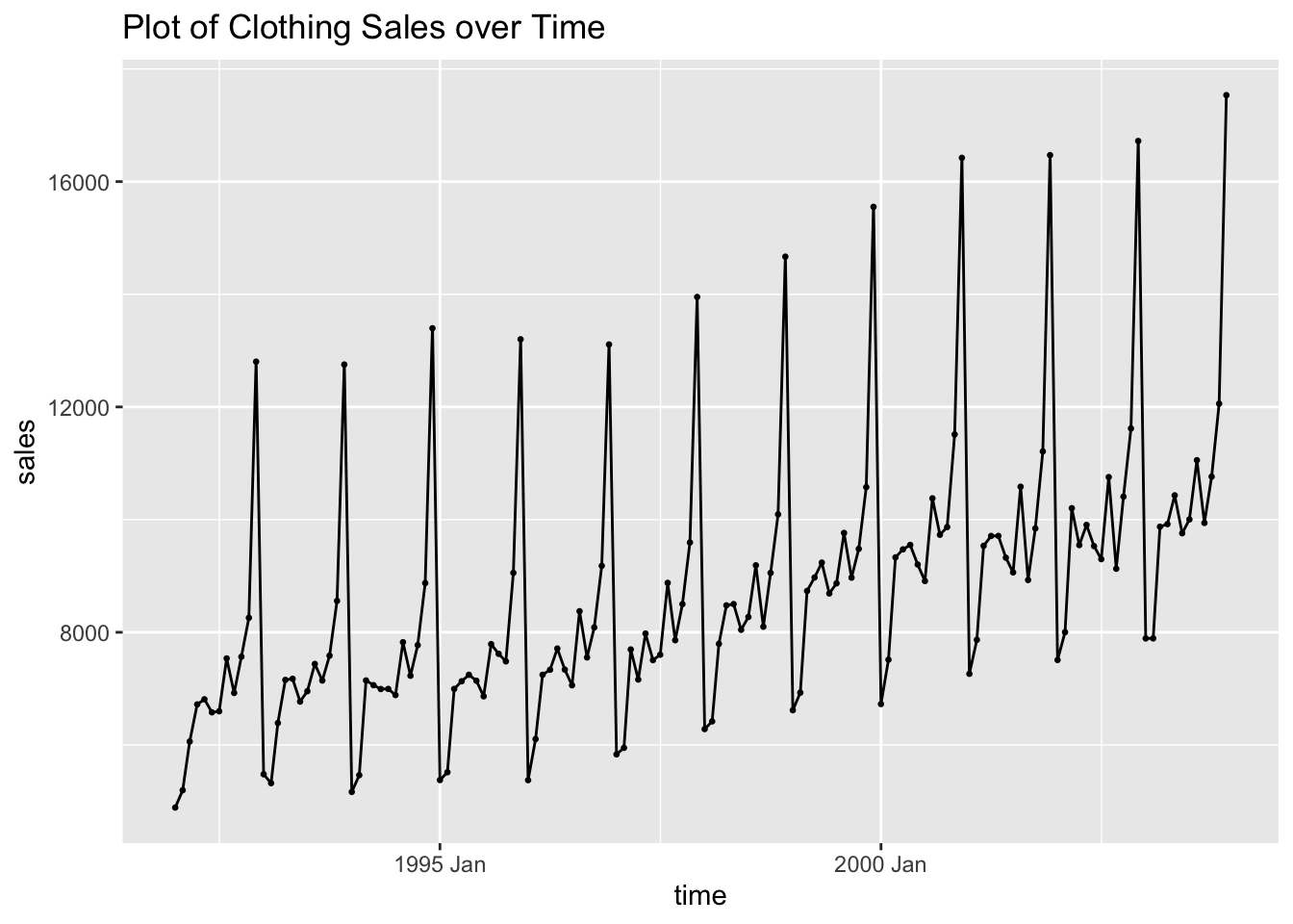 As always, my first step is to plot the time series. The data clearly has an upward trend and appears to contain seasonality.