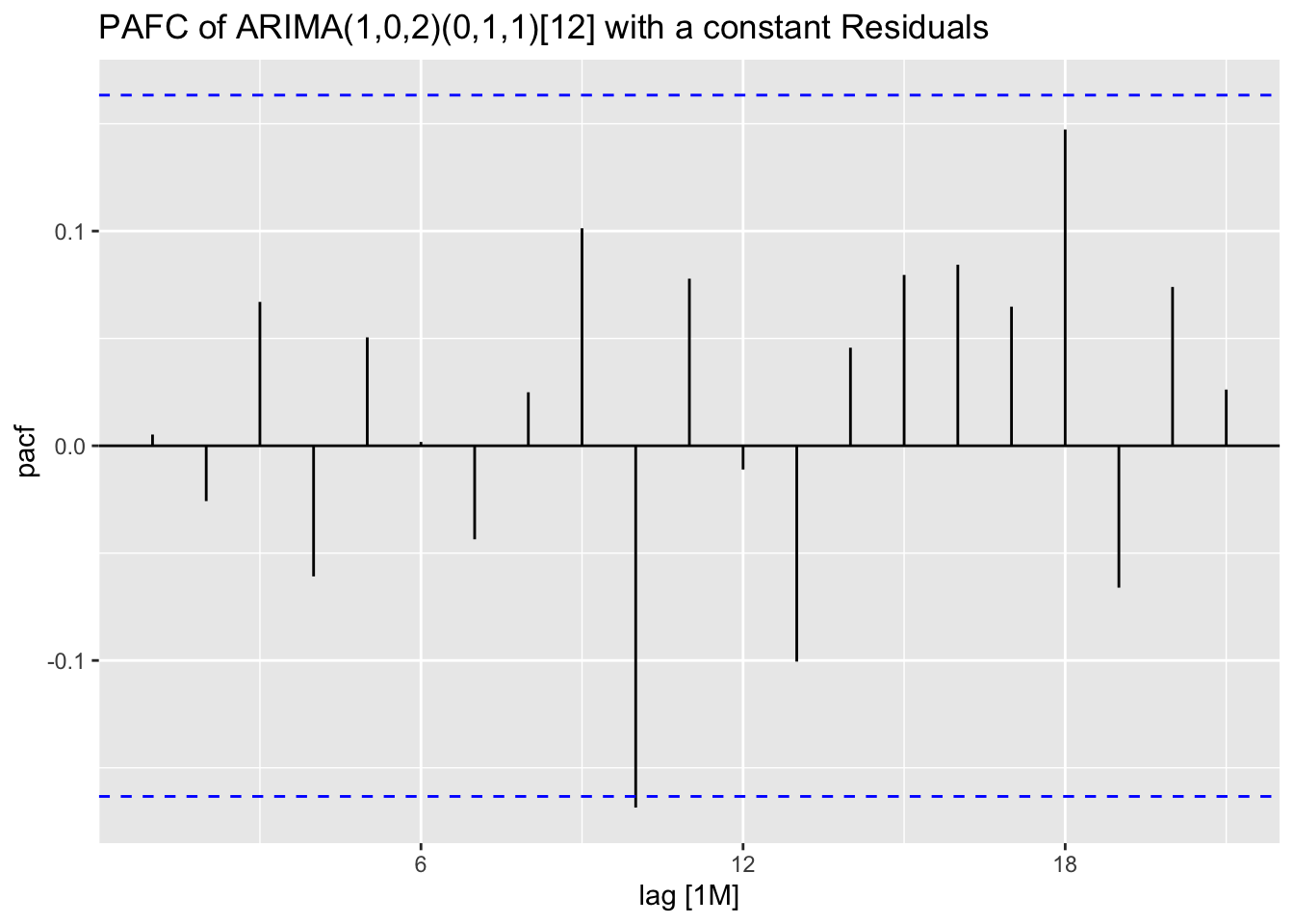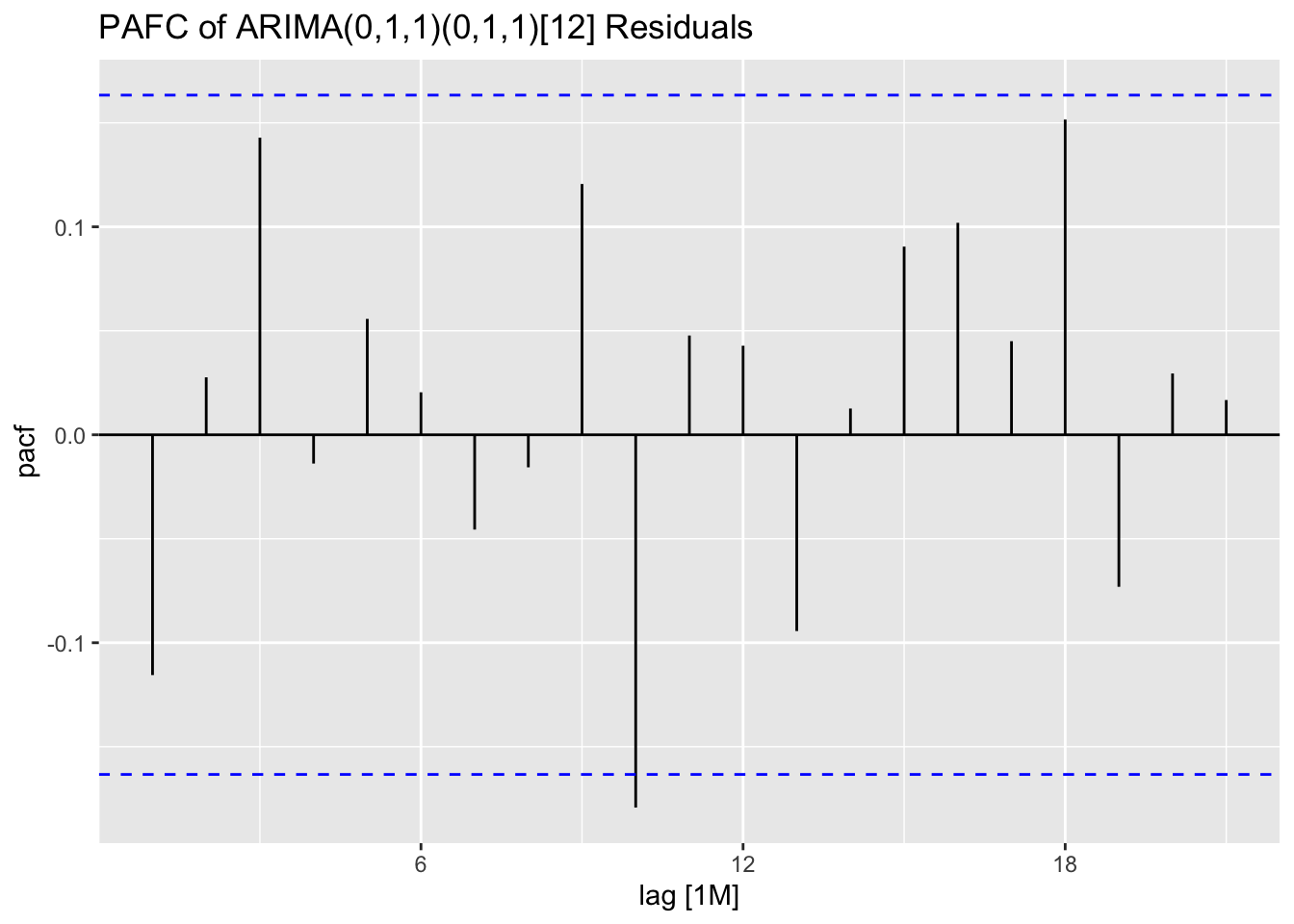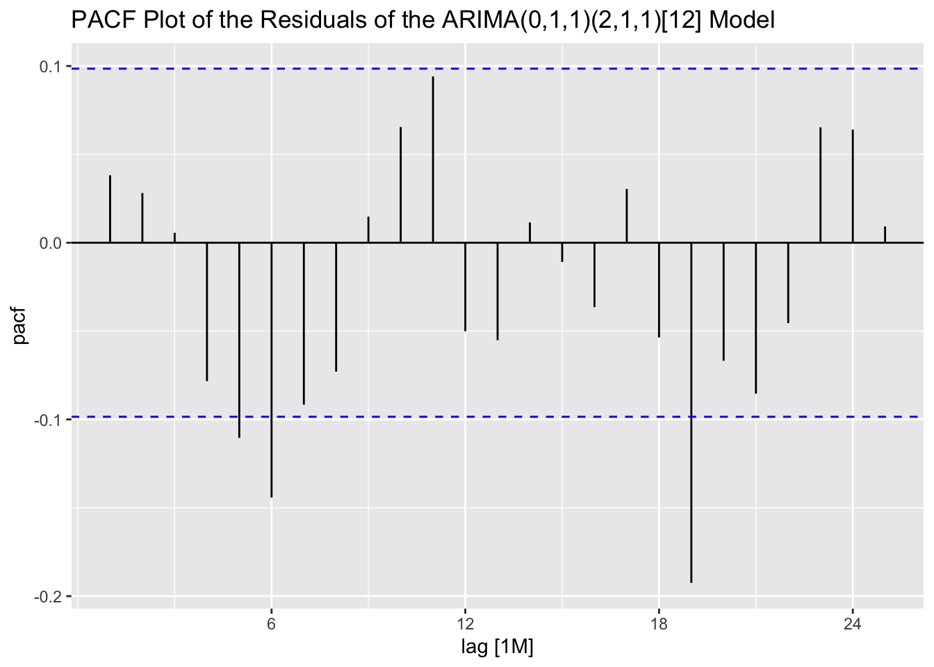 labs(title = "PACF Plot of the Residuals of the ARIMA(0,1,1)(2,1,1)[12] Model")